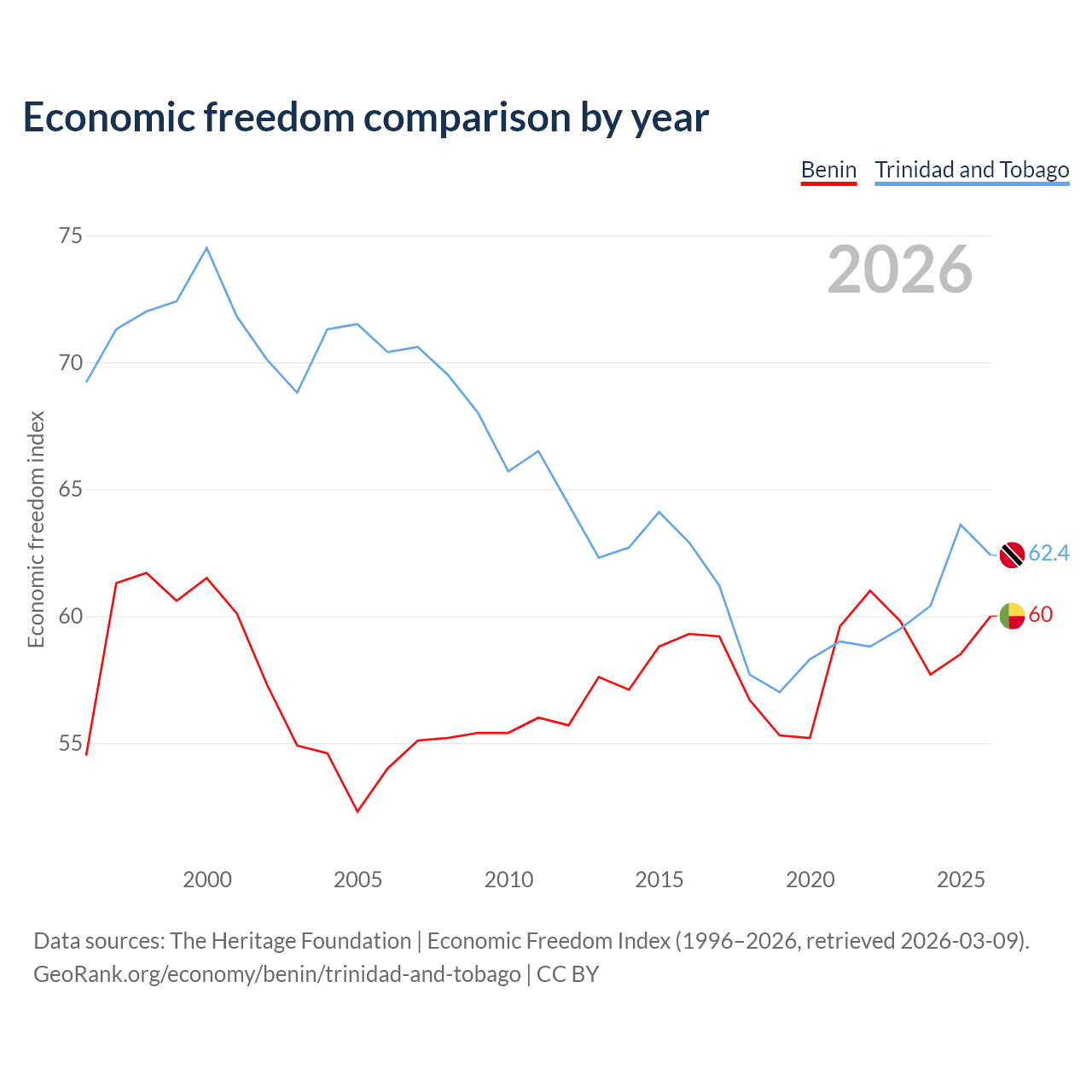 The Economic Freedom Index for Benin is 60, ranking 96/197, compared to 62.4 for Trinidad and Tobago, ranking 87/197. The chart above displays a comparison of annual changes in economic freedom indexes.