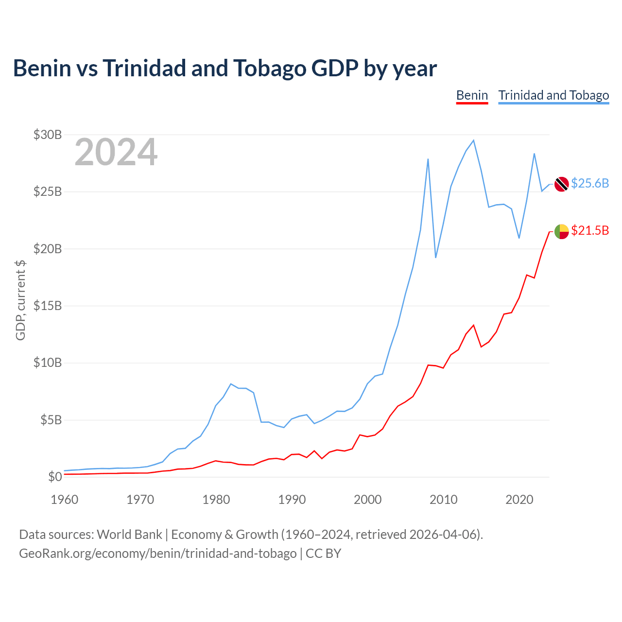 Benin has a GDP of $21.5B compared to $25.6B for Trinidad and Tobago, ranking 126/197 and 115/197 by economy size, respectively.
