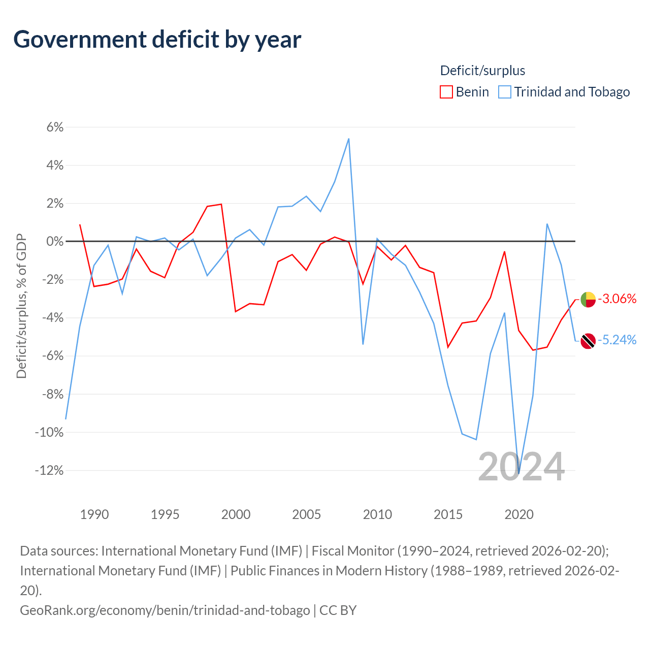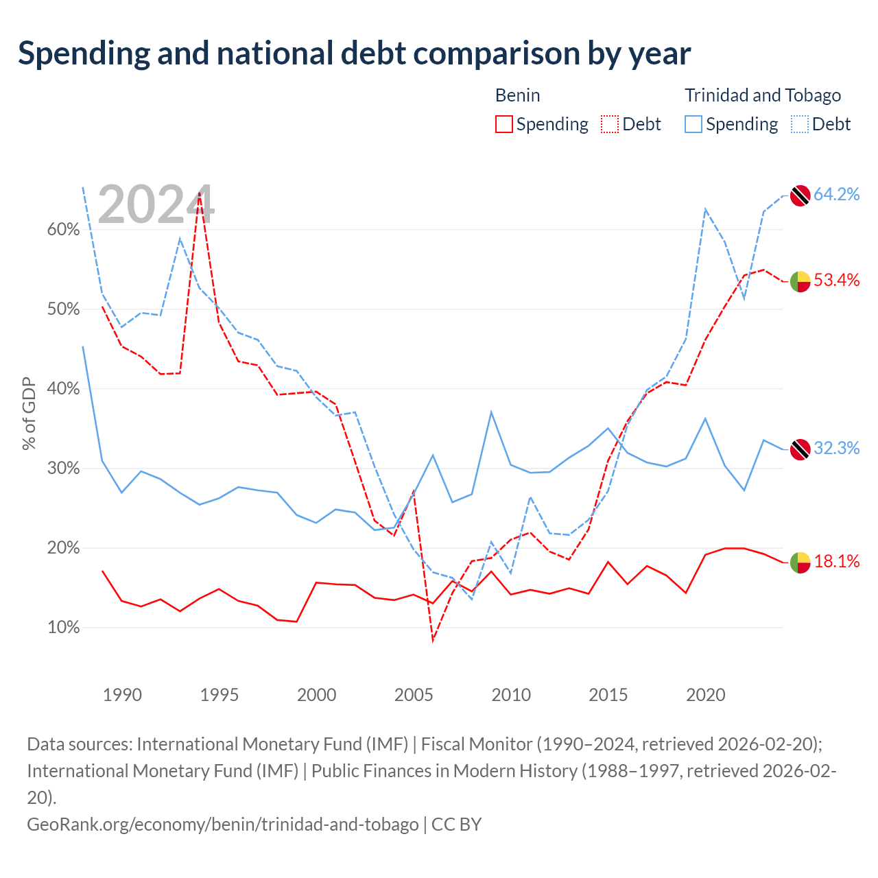Benin has $11.5B in government debt (53.4% of GDP), compared to $16.5B (64.2% of GDP) in Trinidad and Tobago.