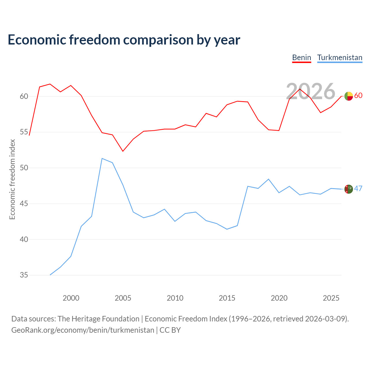 The Economic Freedom Index for Benin is 60, ranking 96/197, compared to 47 for Turkmenistan, ranking 177/197. The chart above displays a comparison of annual changes in economic freedom indexes.