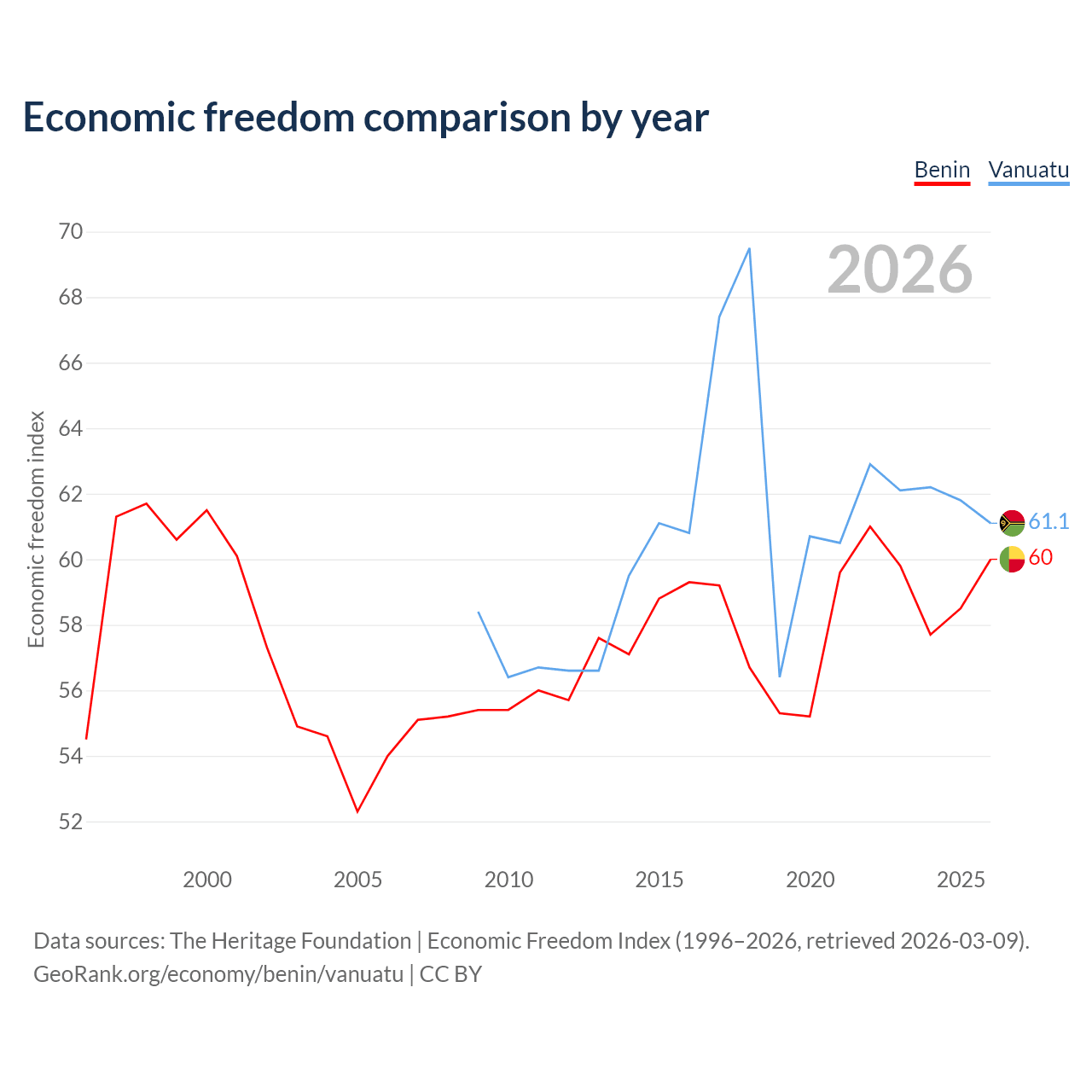 The Economic Freedom Index for Benin is 60, ranking 96/197, compared to 61.1 for Vanuatu, ranking 92/197. The chart above displays a comparison of annual changes in economic freedom indexes.