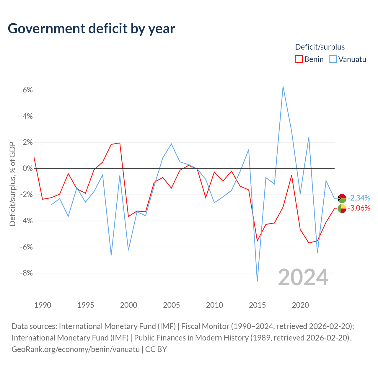 Benin has a GDP of $21.5B compared to $1.12B for Vanuatu, ranking 126/197 and 188/197 by economy size, respectively.