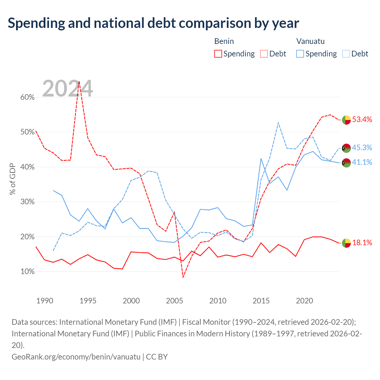 Benin has $11.5B in government debt (53.4% of GDP), compared to $507M (45.3% of GDP) in Vanuatu.