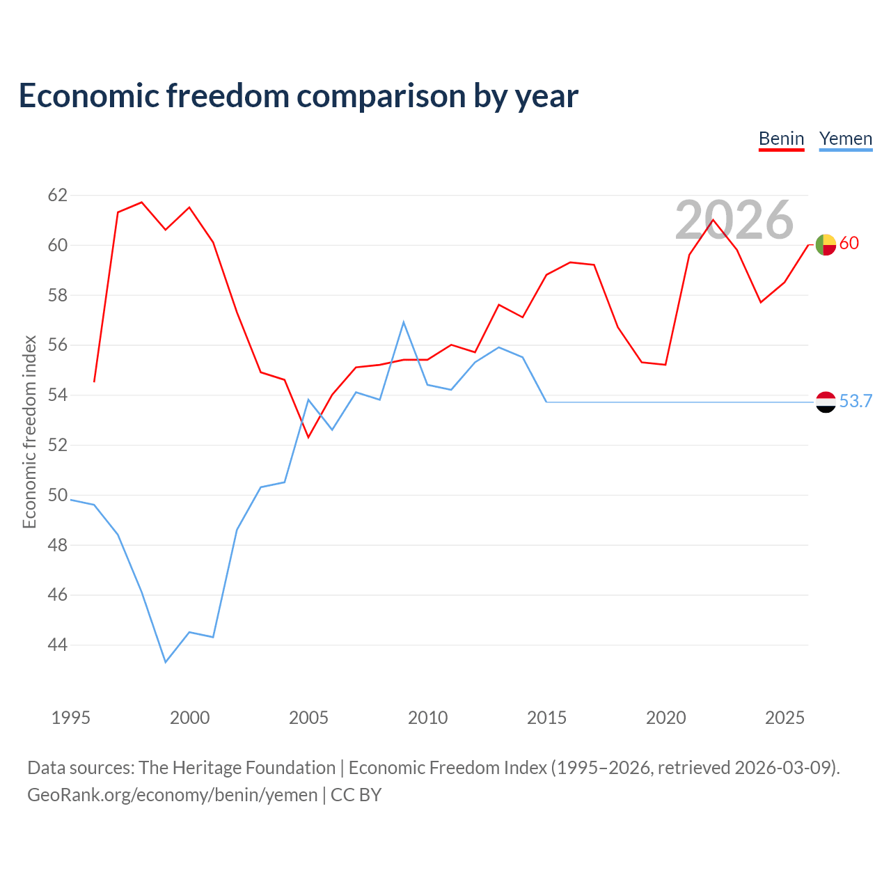 The Economic Freedom Index for Benin is 60, ranking 96/197, compared to 53.7 for Yemen, ranking 138/197. The chart above displays a comparison of annual changes in economic freedom indexes.