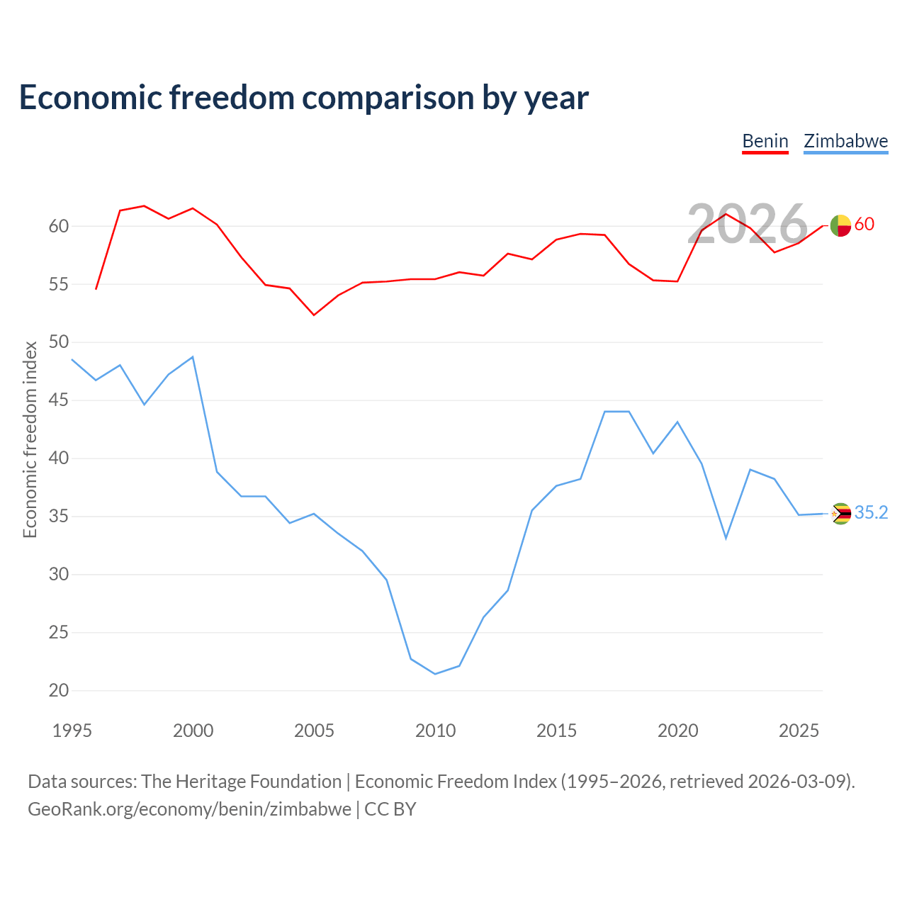 The Economic Freedom Index for Benin is 60, ranking 96/197, compared to 35.2 for Zimbabwe, ranking 190/197. The chart above displays a comparison of annual changes in economic freedom indexes.