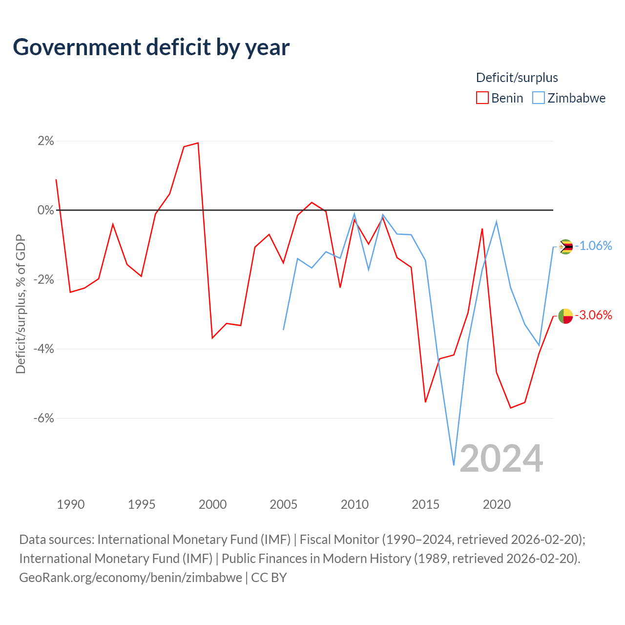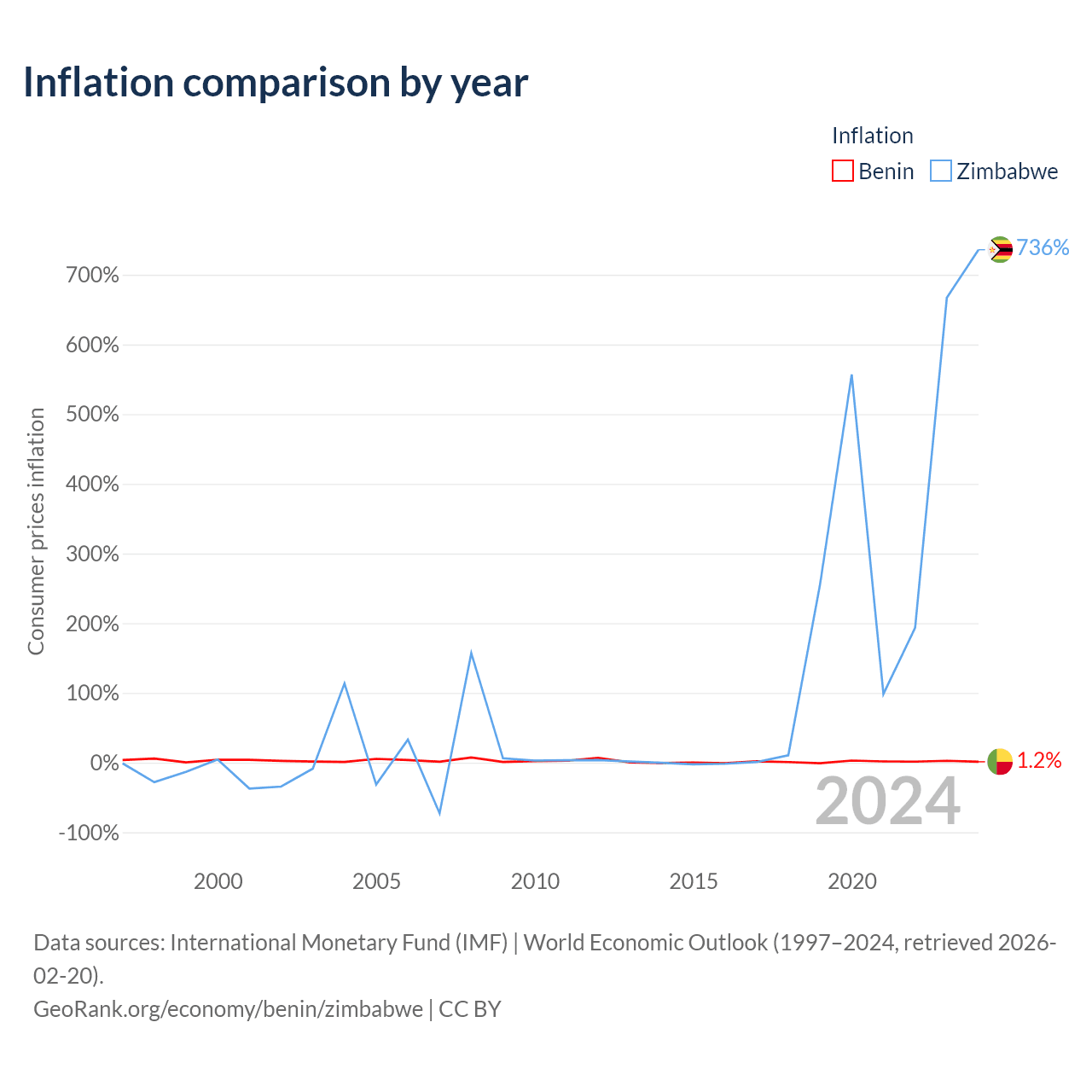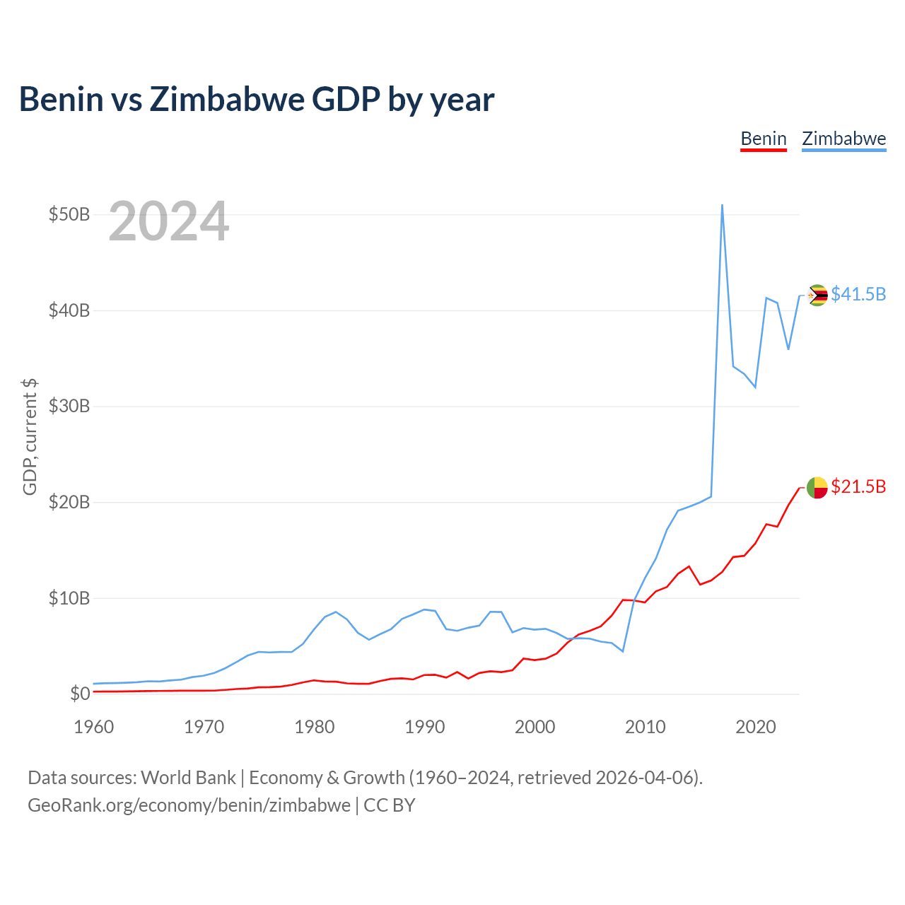 Benin has a GDP of $21.5B compared to $41.5B for Zimbabwe, ranking 126/197 and 102/197 by economy size, respectively.