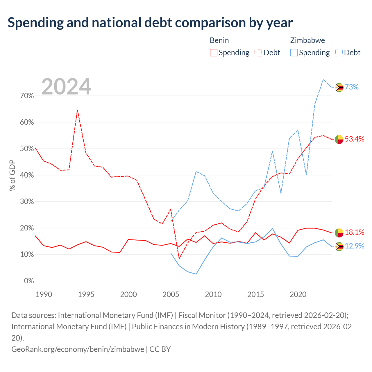 Benin has $11.5B in government debt (53.4% of GDP), compared to $30.3B (73% of GDP) in Zimbabwe.
