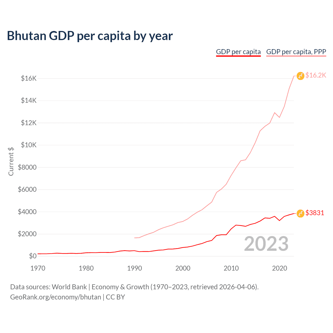 Data sources: World Bank | Economy & Growth (1970–2023, retrieved 2026-04-06).