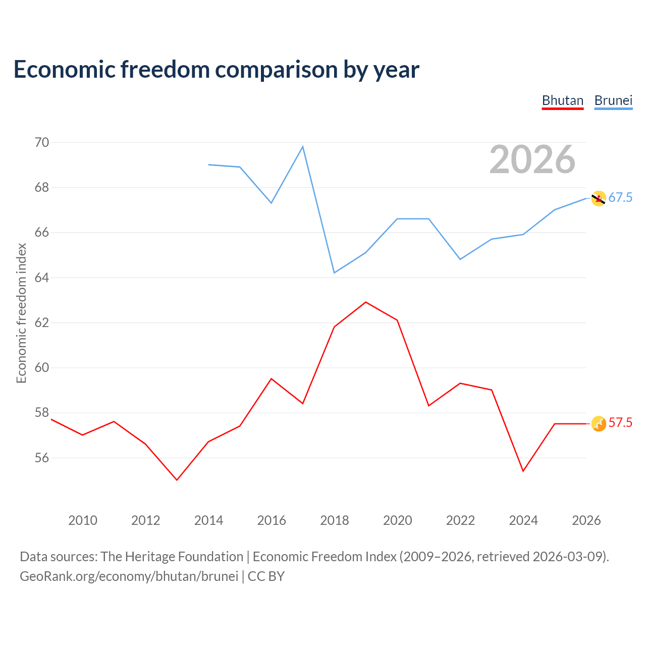The Economic Freedom Index for Bhutan is 57.5, ranking 115/197, compared to 67.5 for Brunei, ranking 55/197. The chart above displays a comparison of annual changes in economic freedom indexes.