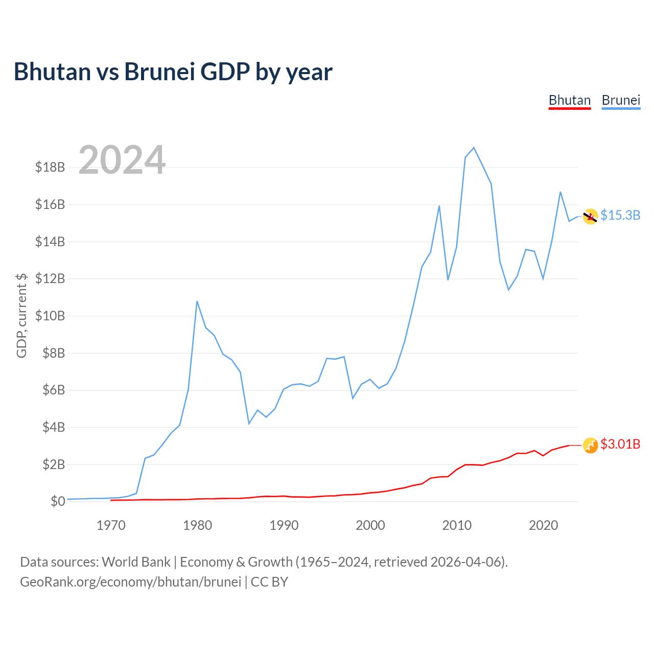 Bhutan has a GDP of $3.01B compared to $15.3B for Brunei, ranking 170/197 and 142/197 by economy size, respectively.