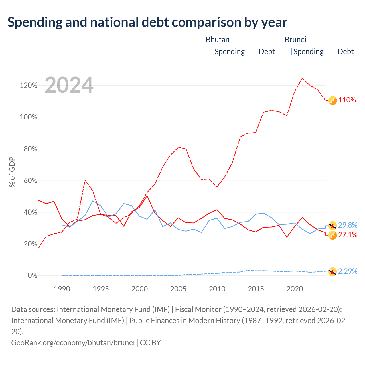 Bhutan has $3.53B in government debt (110.4% of GDP), compared to $351M (2.29% of GDP) in Brunei.