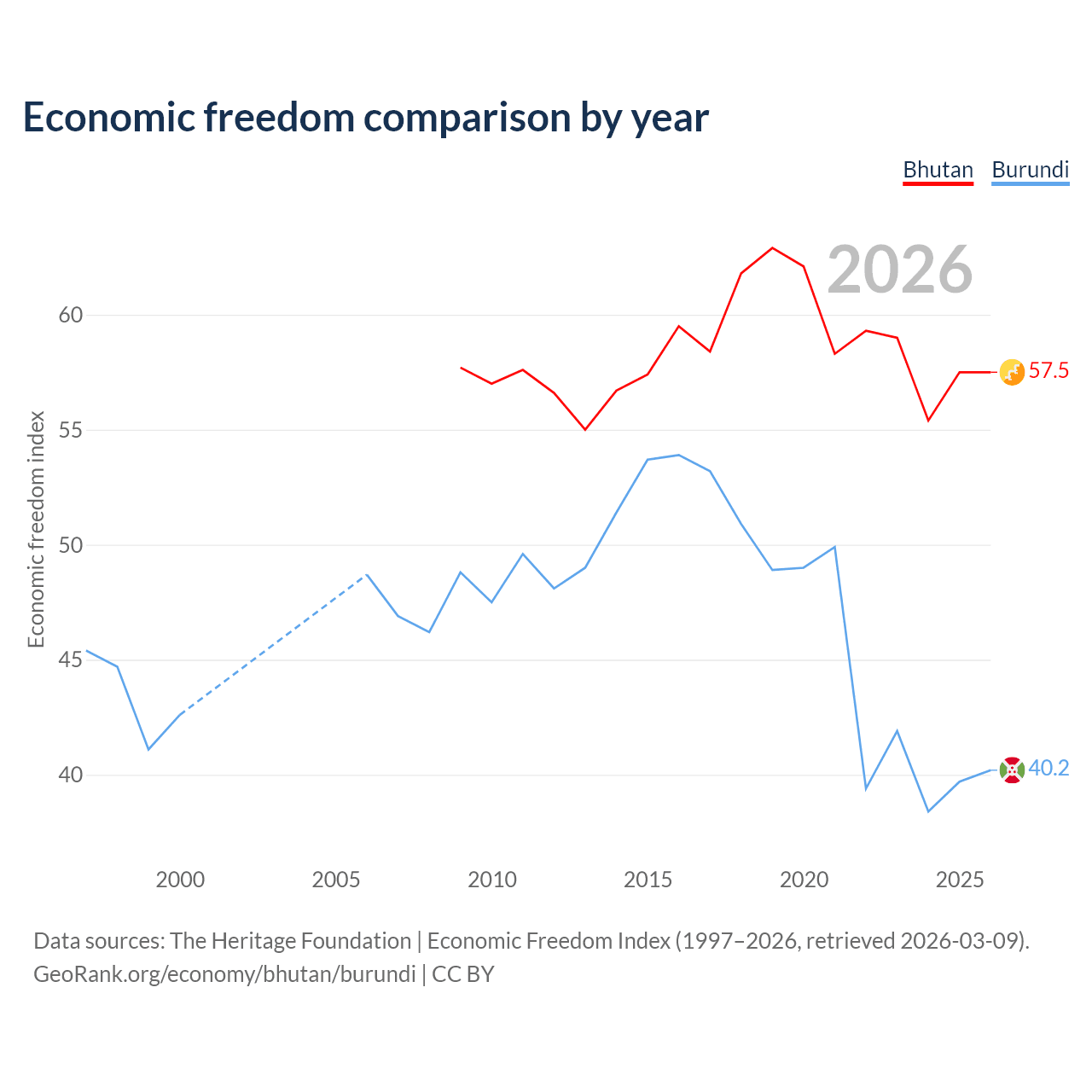 The Economic Freedom Index for Bhutan is 57.5, ranking 115/197, compared to 40.2 for Burundi, ranking 187/197. The chart above displays a comparison of annual changes in economic freedom indexes.