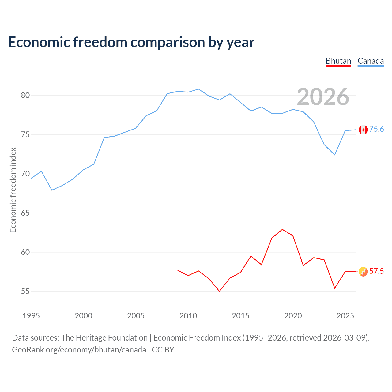 The Economic Freedom Index for Bhutan is 57.5, ranking 115/197, compared to 75.6 for Canada, ranking 17/197. The chart above displays a comparison of annual changes in economic freedom indexes.