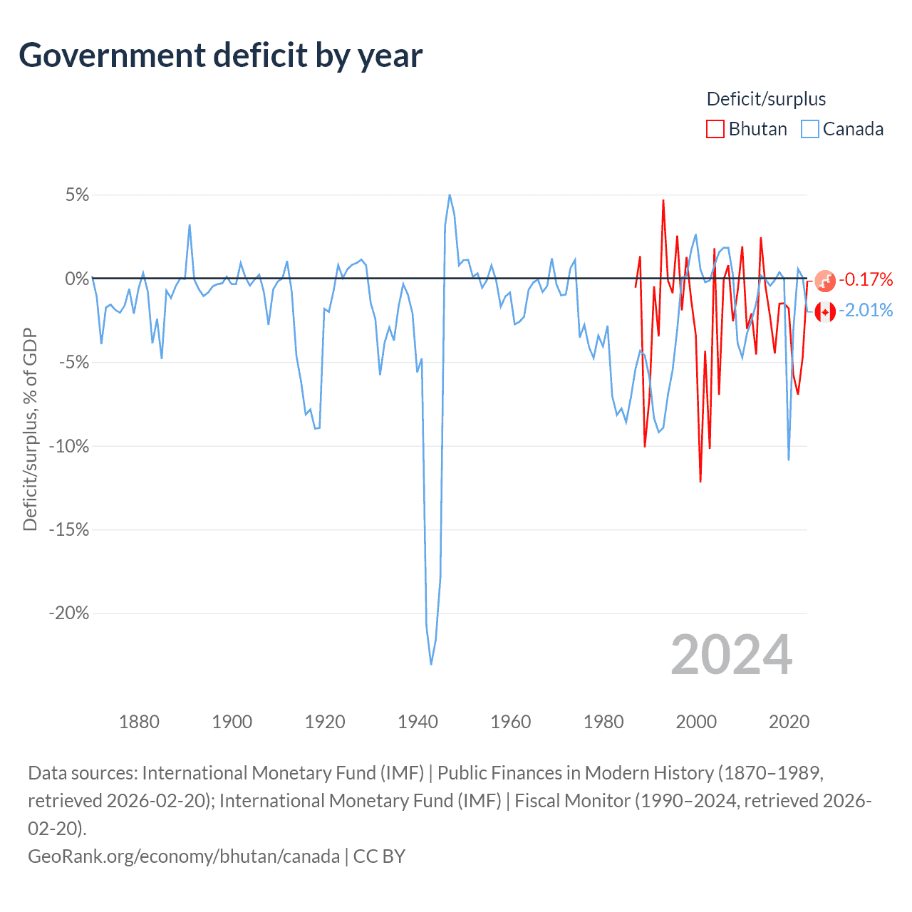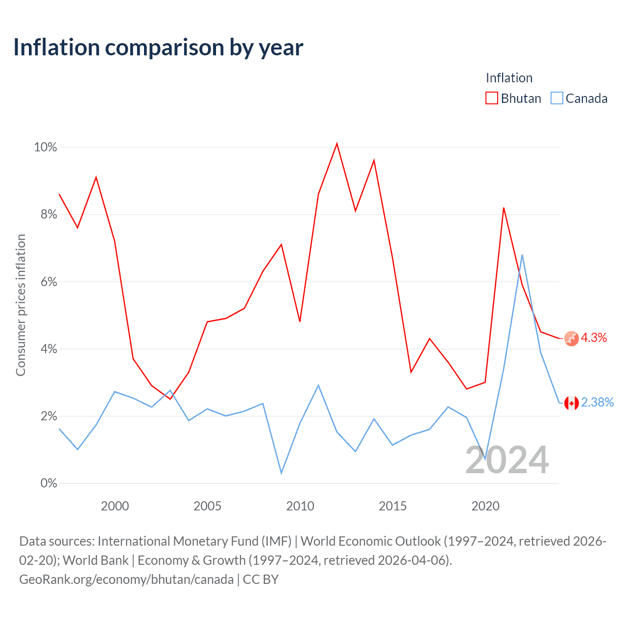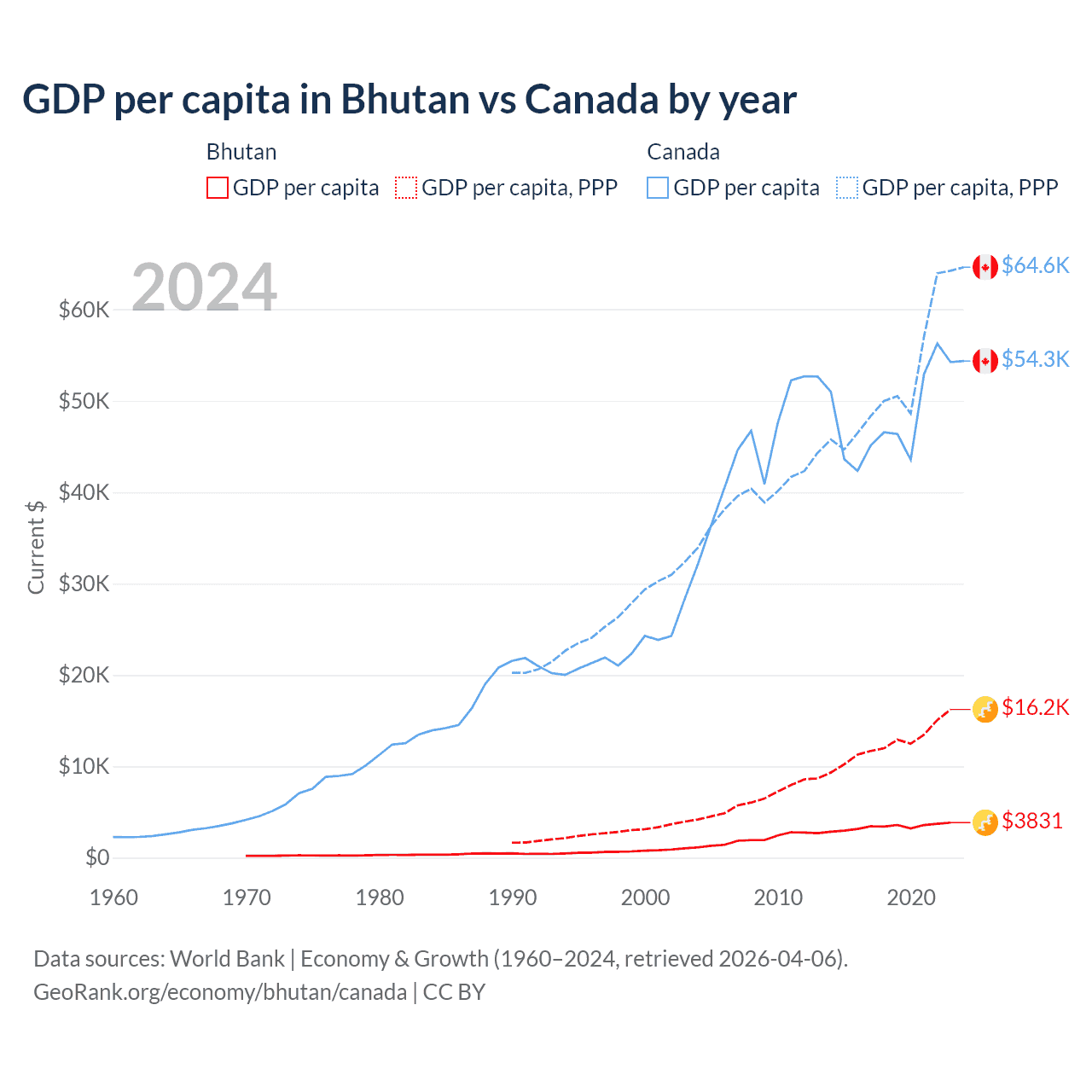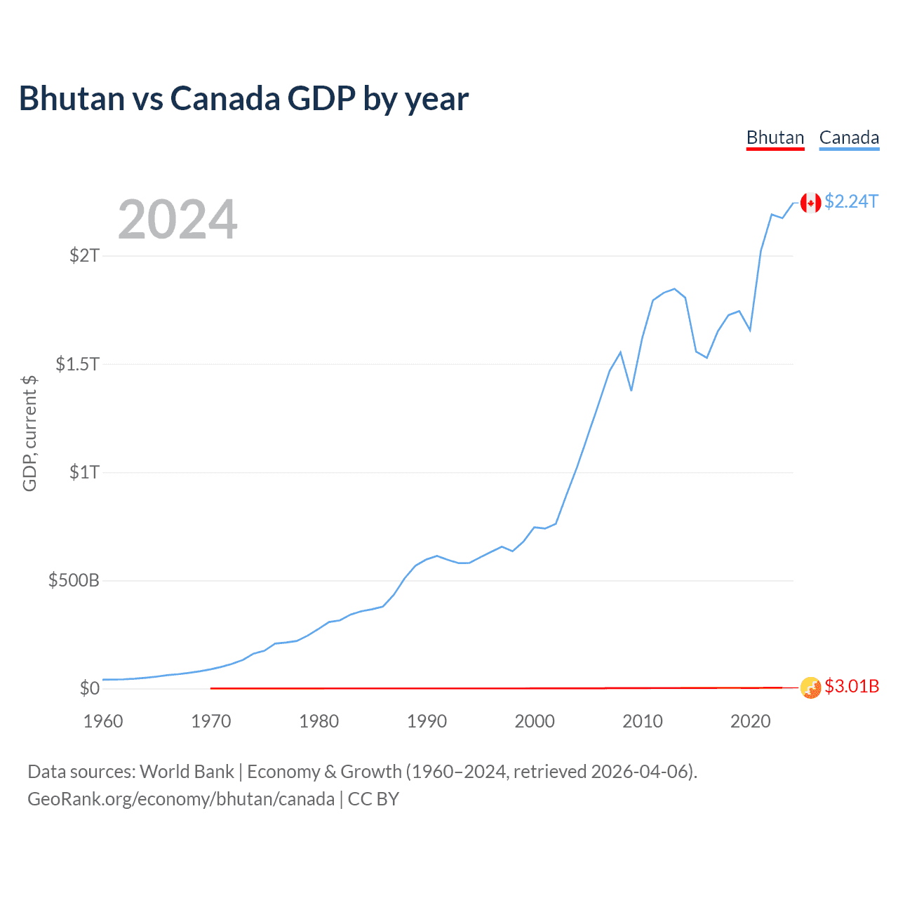 Bhutan has a GDP of $3.01B compared to $2.24T for Canada, ranking 170/197 and 9/197 by economy size, respectively.