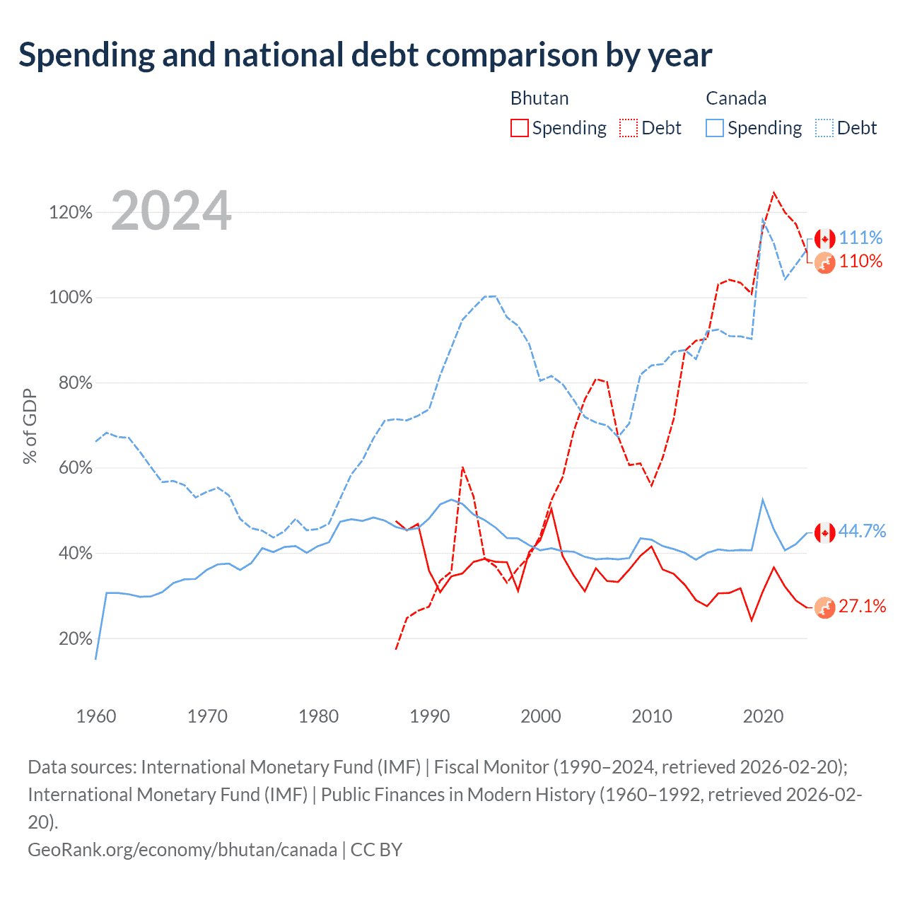 Bhutan has $3.53B in government debt (110.4% of GDP), compared to $2.5T (111.3% of GDP) in Canada.