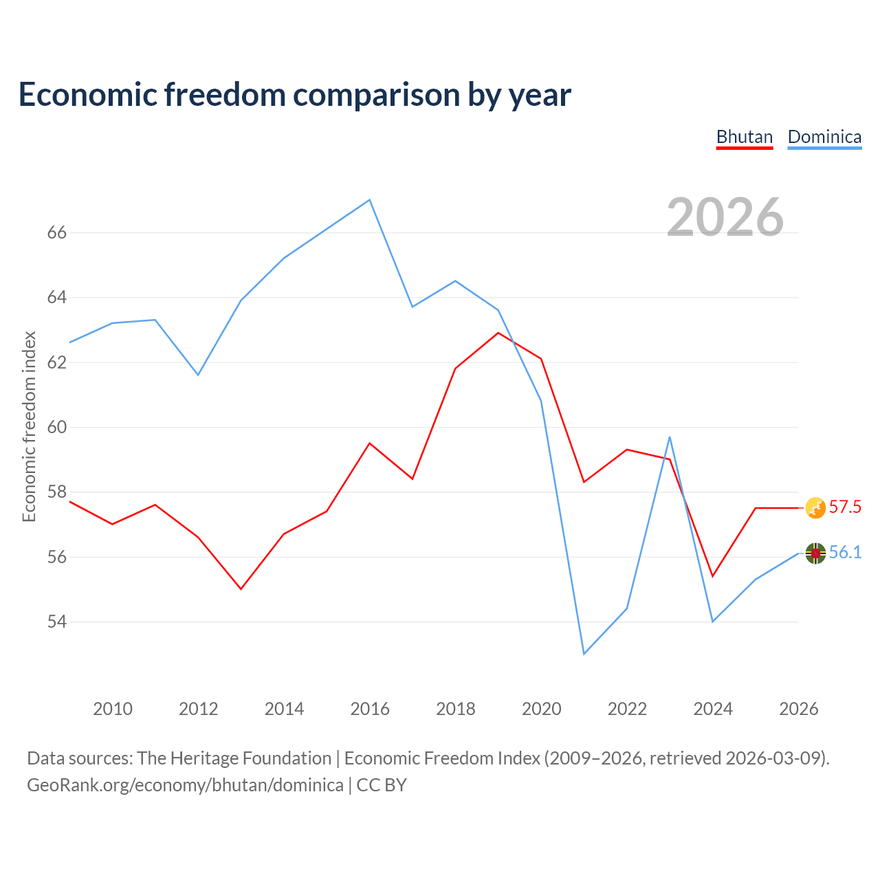 The Economic Freedom Index for Bhutan is 57.5, ranking 115/197, compared to 56.1 for Dominica, ranking 124/197. The chart above displays a comparison of annual changes in economic freedom indexes.