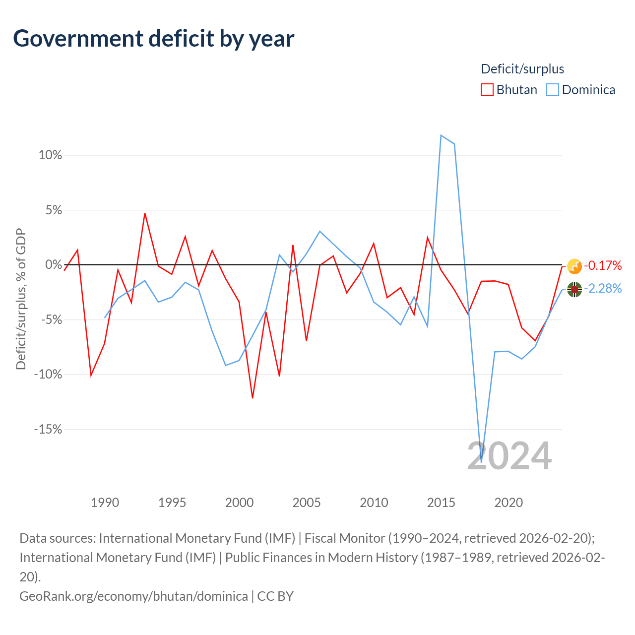 Bhutan has a GDP of $3.01B compared to $689M for Dominica, ranking 170/197 and 190/197 by economy size, respectively.