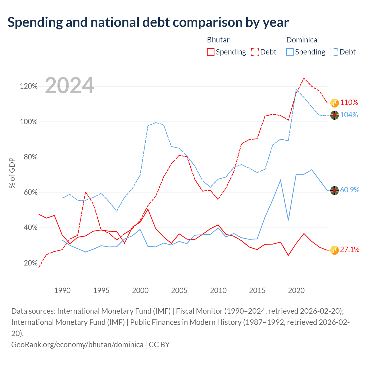 Bhutan has $3.53B in government debt (110.4% of GDP), compared to $713M (103.5% of GDP) in Dominica.