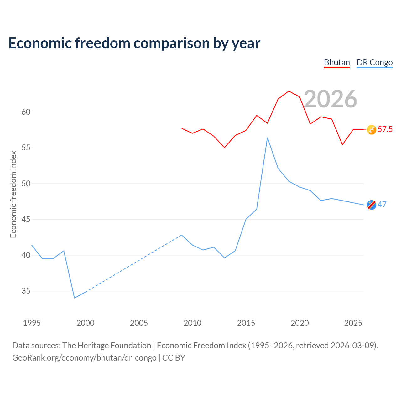 The Economic Freedom Index for Bhutan is 57.5, ranking 115/197, compared to 47 for the DR Congo, ranking 176/197. The chart above displays a comparison of annual changes in economic freedom indexes.