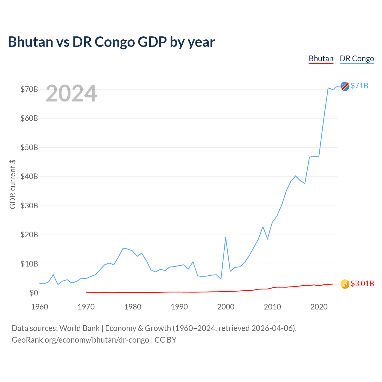 Bhutan has a GDP of $3.01B compared to $71B for the DR Congo, ranking 170/197 and 87/197 by economy size, respectively.