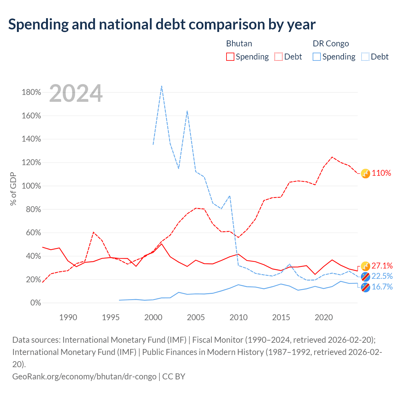 Bhutan has $3.53B in government debt (110.4% of GDP), compared to $16B (22.5% of GDP) in the DR Congo.