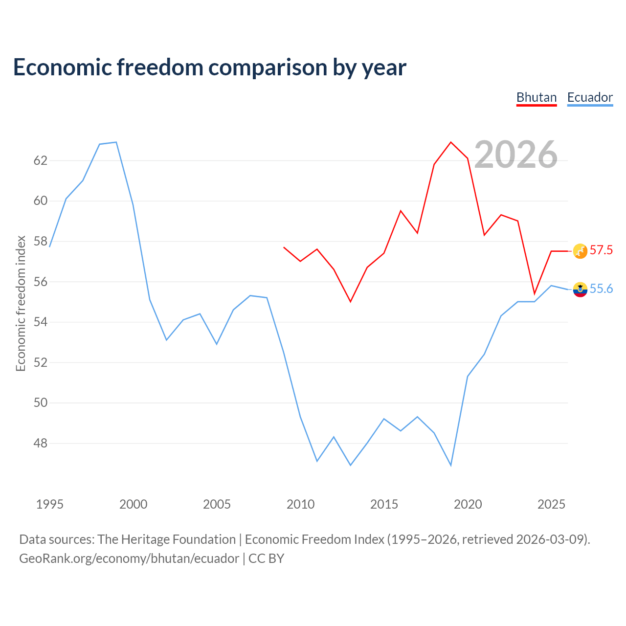 The Economic Freedom Index for Bhutan is 57.5, ranking 115/197, compared to 55.6 for Ecuador, ranking 127/197. The chart above displays a comparison of annual changes in economic freedom indexes.
