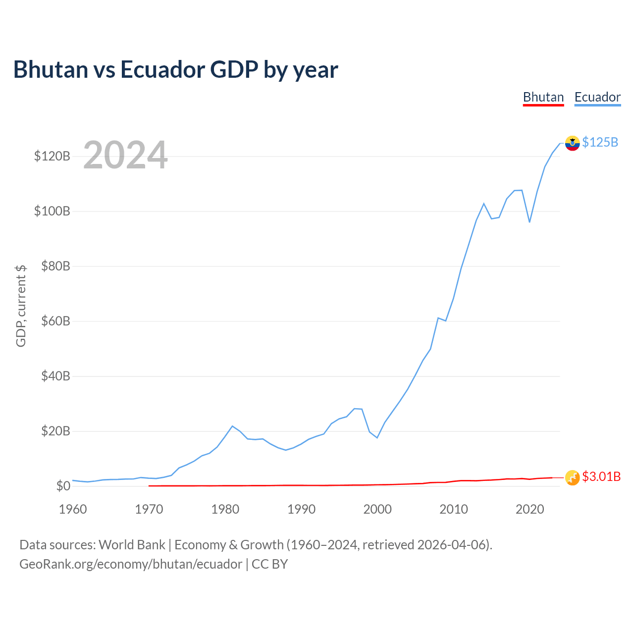 Bhutan has a GDP of $3.01B compared to $125B for Ecuador, ranking 170/197 and 62/197 by economy size, respectively.