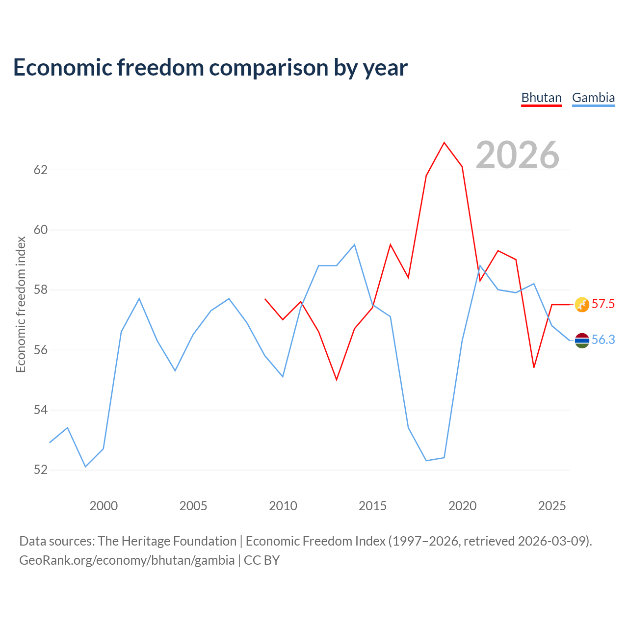 The Economic Freedom Index for Bhutan is 57.5, ranking 115/197, compared to 56.3 for the Gambia, ranking 123/197. The chart above displays a comparison of annual changes in economic freedom indexes.