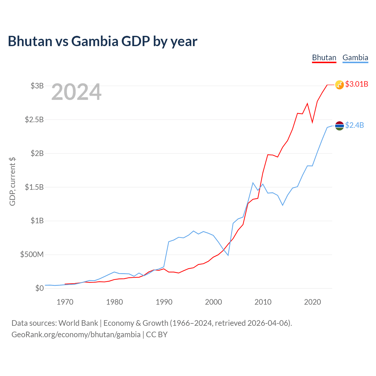 Bhutan has a GDP of $3.01B compared to $2.4B for the Gambia, ranking 170/197 and 174/197 by economy size, respectively.