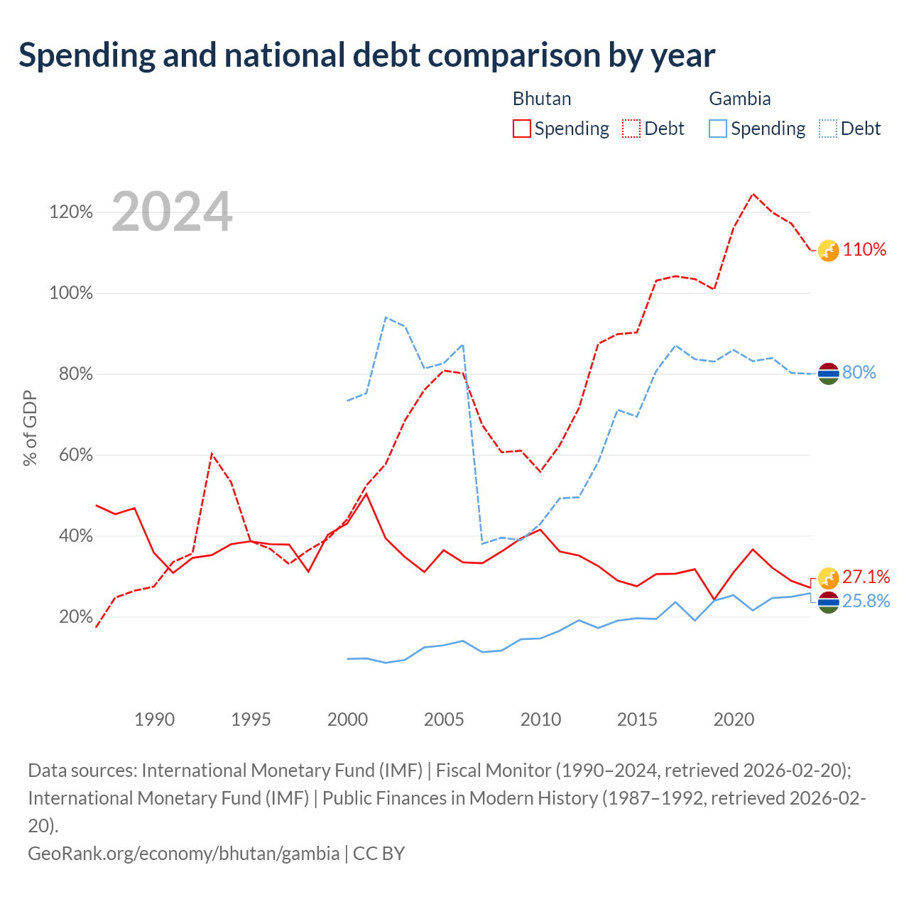 Bhutan has $3.53B in government debt (110.4% of GDP), compared to $1.92B (80% of GDP) in the Gambia.