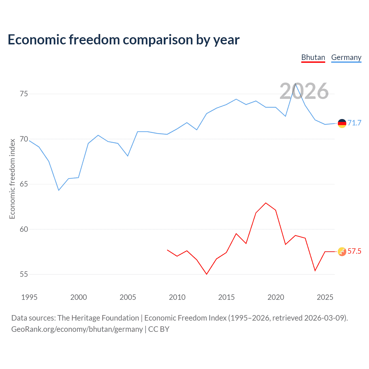 The Economic Freedom Index for Bhutan is 57.5, ranking 115/197, compared to 71.7 for Germany, ranking 30/197. The chart above displays a comparison of annual changes in economic freedom indexes.