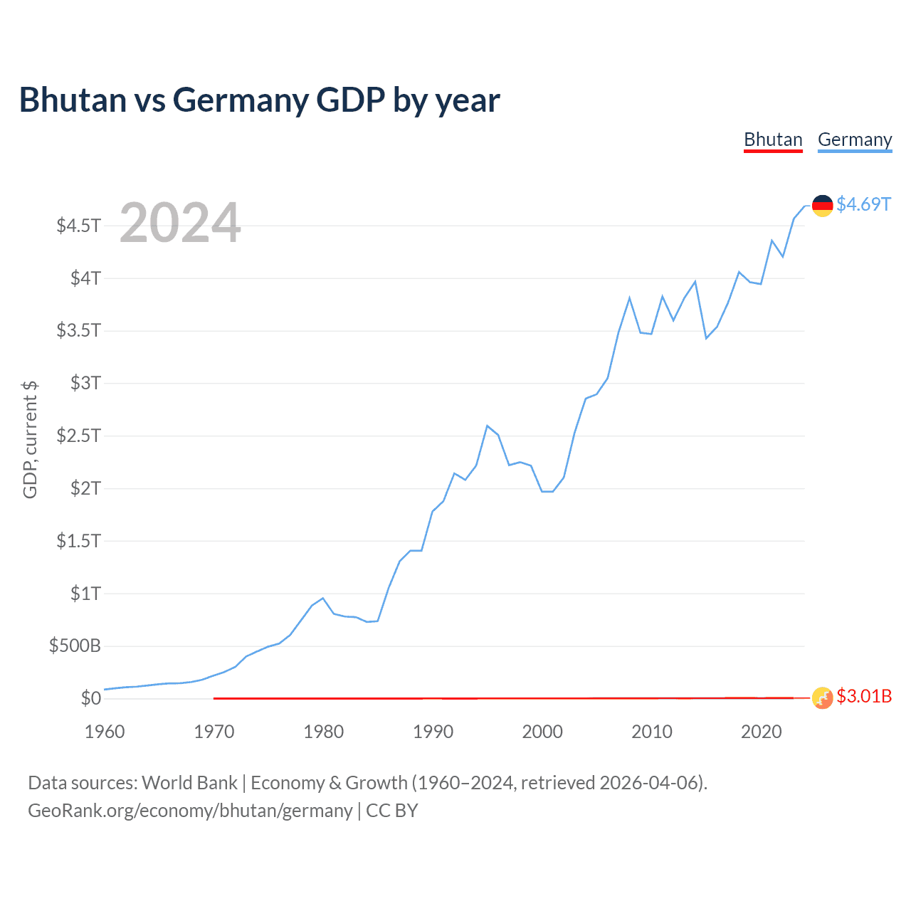Bhutan has a GDP of $3.01B compared to $4.69T for Germany, ranking 170/197 and 3/197 by economy size, respectively.