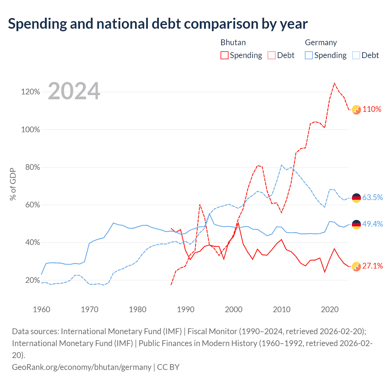 Bhutan has $3.53B in government debt (110.4% of GDP), compared to $2.97T (63.5% of GDP) in Germany.
