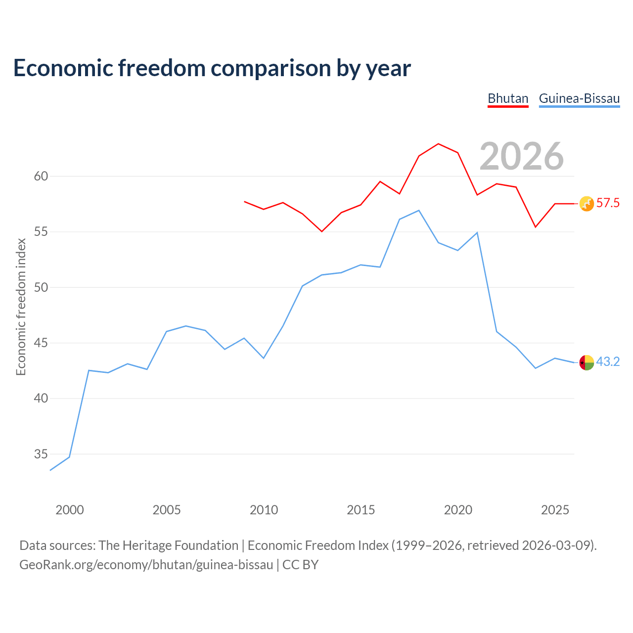 The Economic Freedom Index for Bhutan is 57.5, ranking 115/197, compared to 43.2 for Guinea-Bissau, ranking 181/197. The chart above displays a comparison of annual changes in economic freedom indexes.