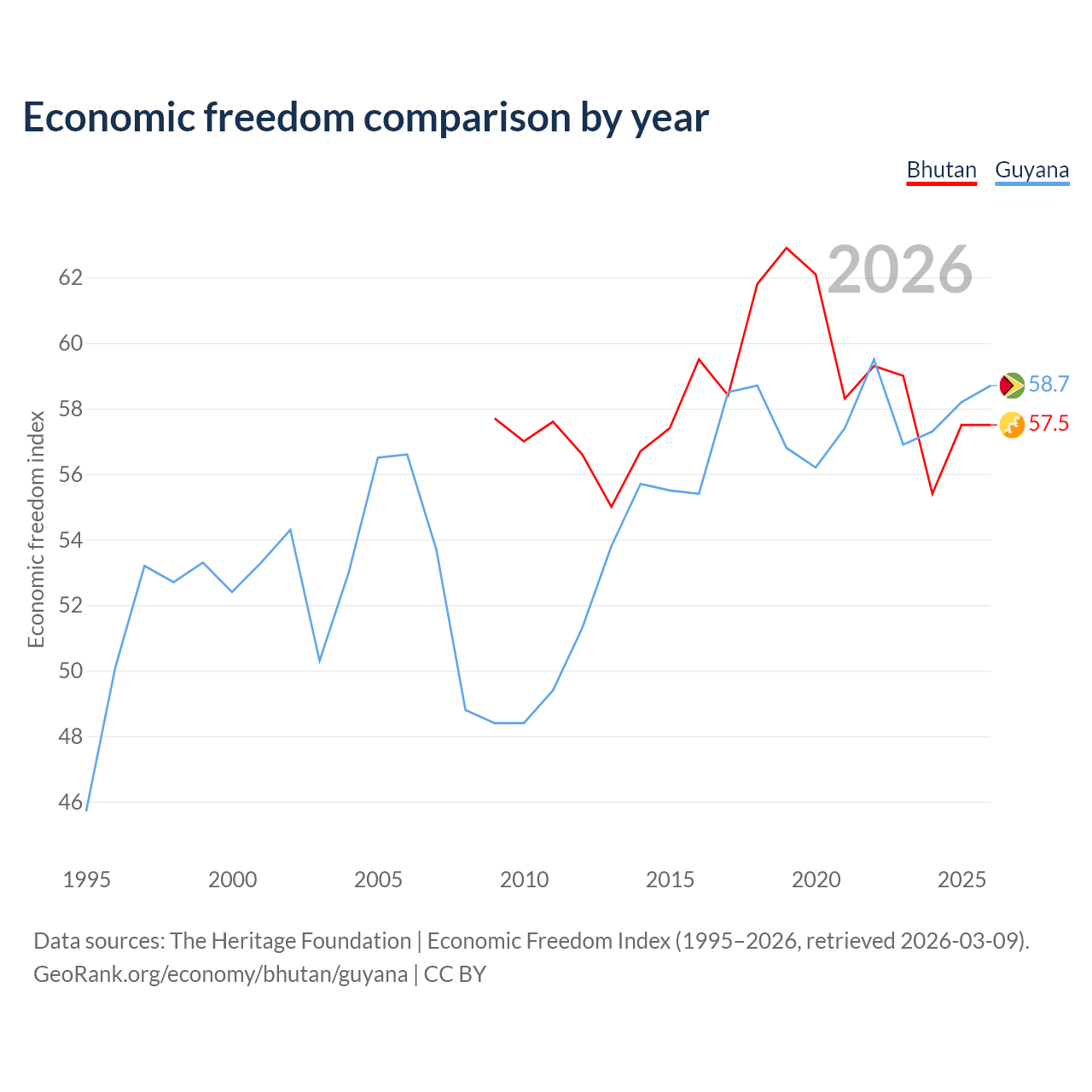 The Economic Freedom Index for Bhutan is 57.5, ranking 115/197, compared to 58.7 for Guyana, ranking 109/197. The chart above displays a comparison of annual changes in economic freedom indexes.