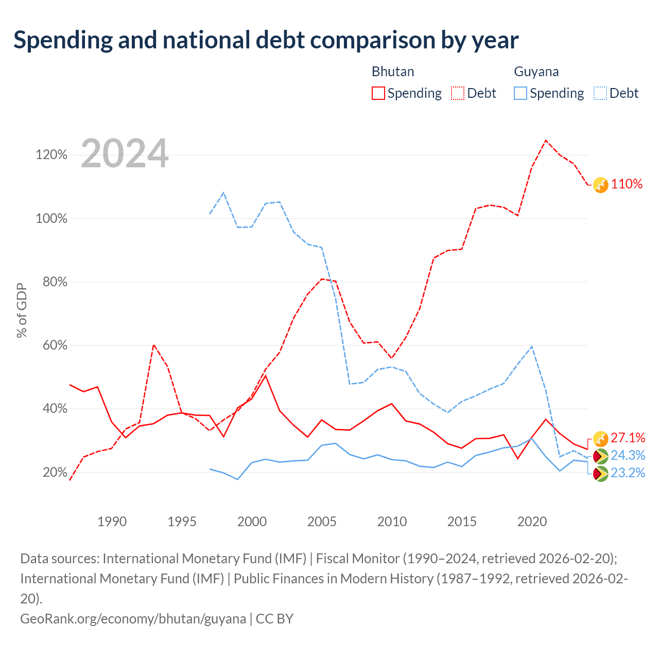 Bhutan has $3.53B in government debt (110.4% of GDP), compared to $5.99B (24.3% of GDP) in Guyana.