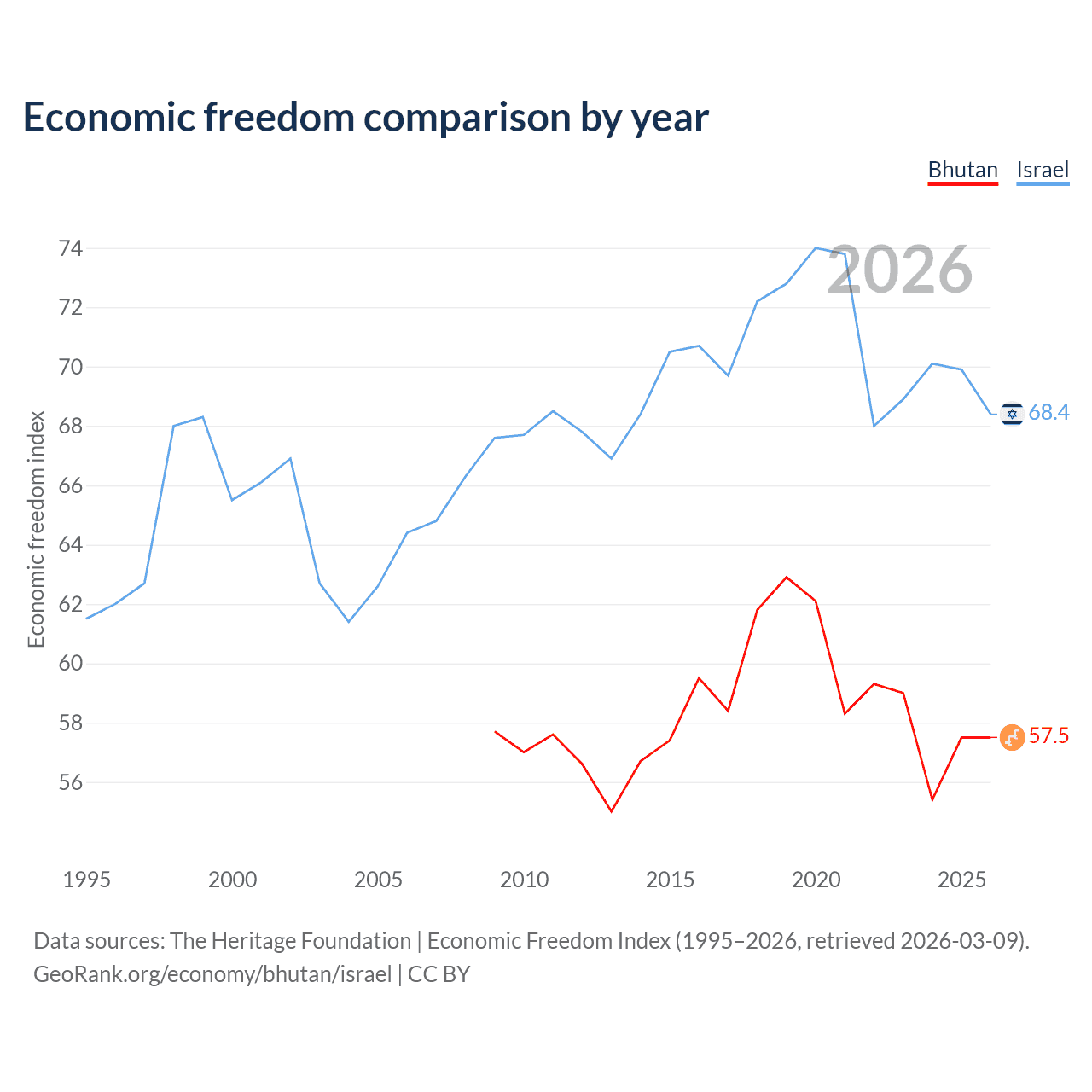 The Economic Freedom Index for Bhutan is 57.5, ranking 115/197, compared to 68.4 for Israel, ranking 47/197. The chart above displays a comparison of annual changes in economic freedom indexes.