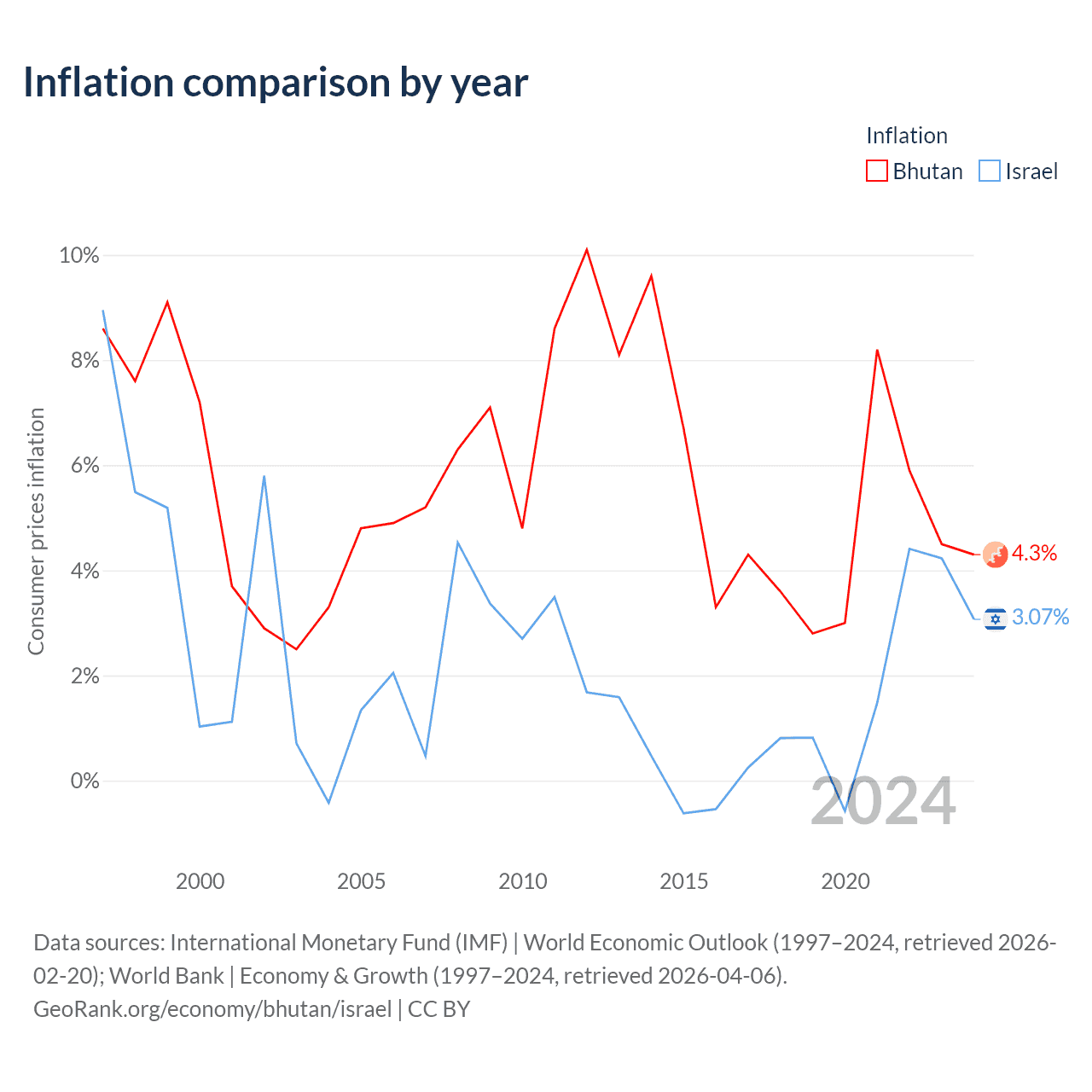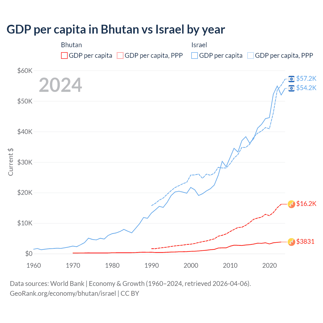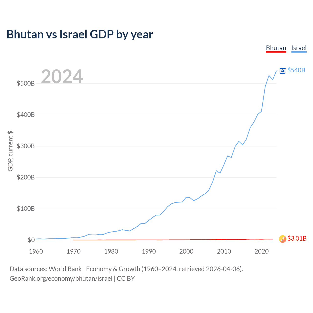 Bhutan has a GDP of $3.01B compared to $540B for Israel, ranking 170/197 and 29/197 by economy size, respectively.