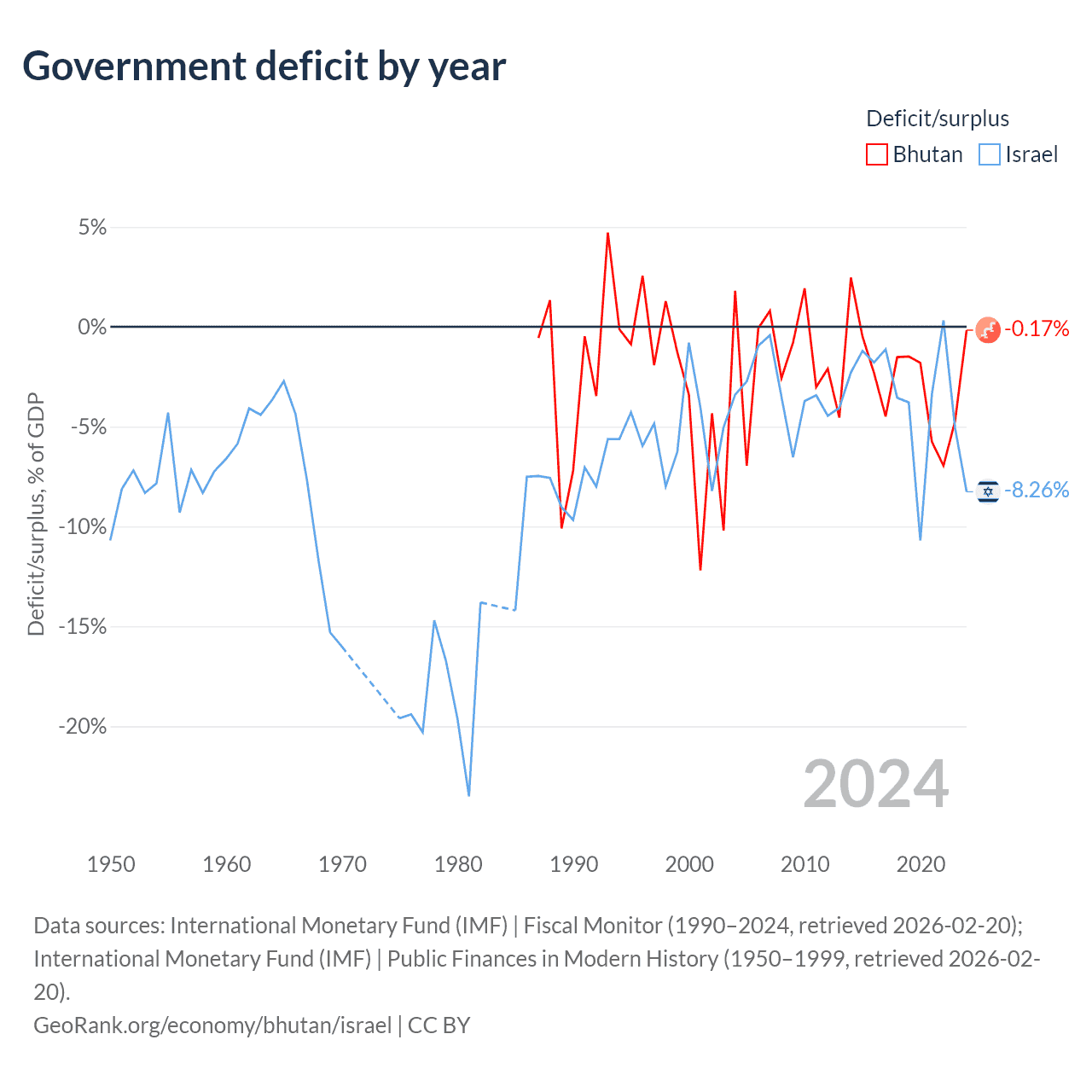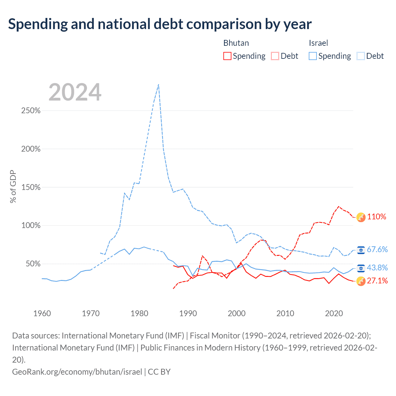 Bhutan has $3.53B in government debt (110.4% of GDP), compared to $366B (67.6% of GDP) in Israel.
