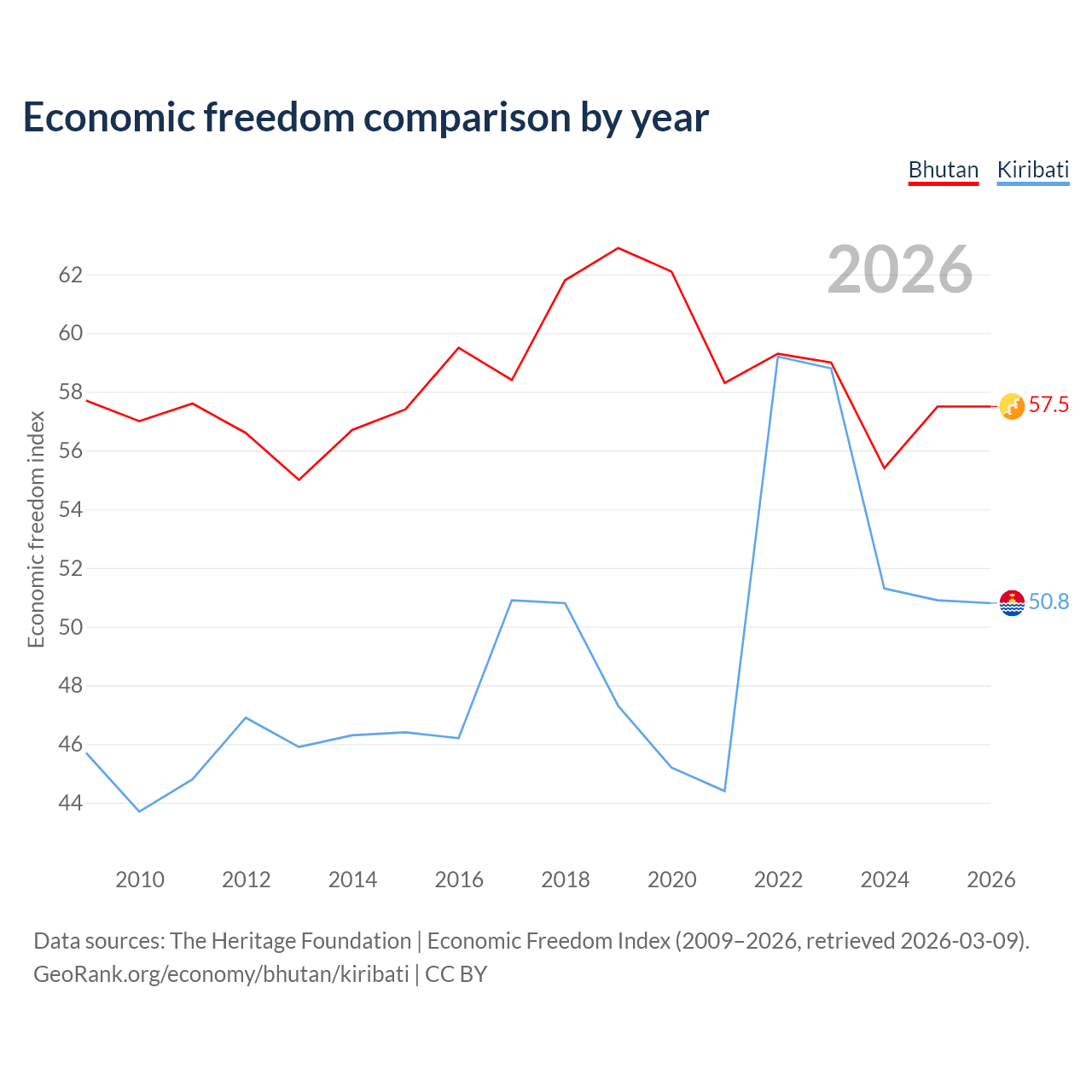 The Economic Freedom Index for Bhutan is 57.5, ranking 115/197, compared to 50.8 for Kiribati, ranking 158/197. The chart above displays a comparison of annual changes in economic freedom indexes.
