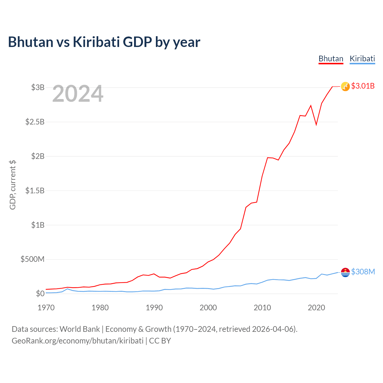 Bhutan has a GDP of $3.01B compared to $308M for Kiribati, ranking 170/197 and 192/197 by economy size, respectively.