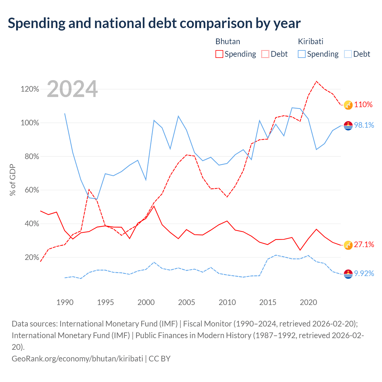 Bhutan has $3.53B in government debt (110.4% of GDP), compared to $30.5M (9.92% of GDP) in Kiribati.