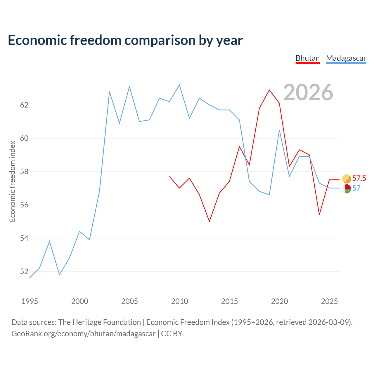 The Economic Freedom Index for Bhutan is 57.5, ranking 115/197, compared to 57 for Madagascar, ranking 119/197. The chart above displays a comparison of annual changes in economic freedom indexes.