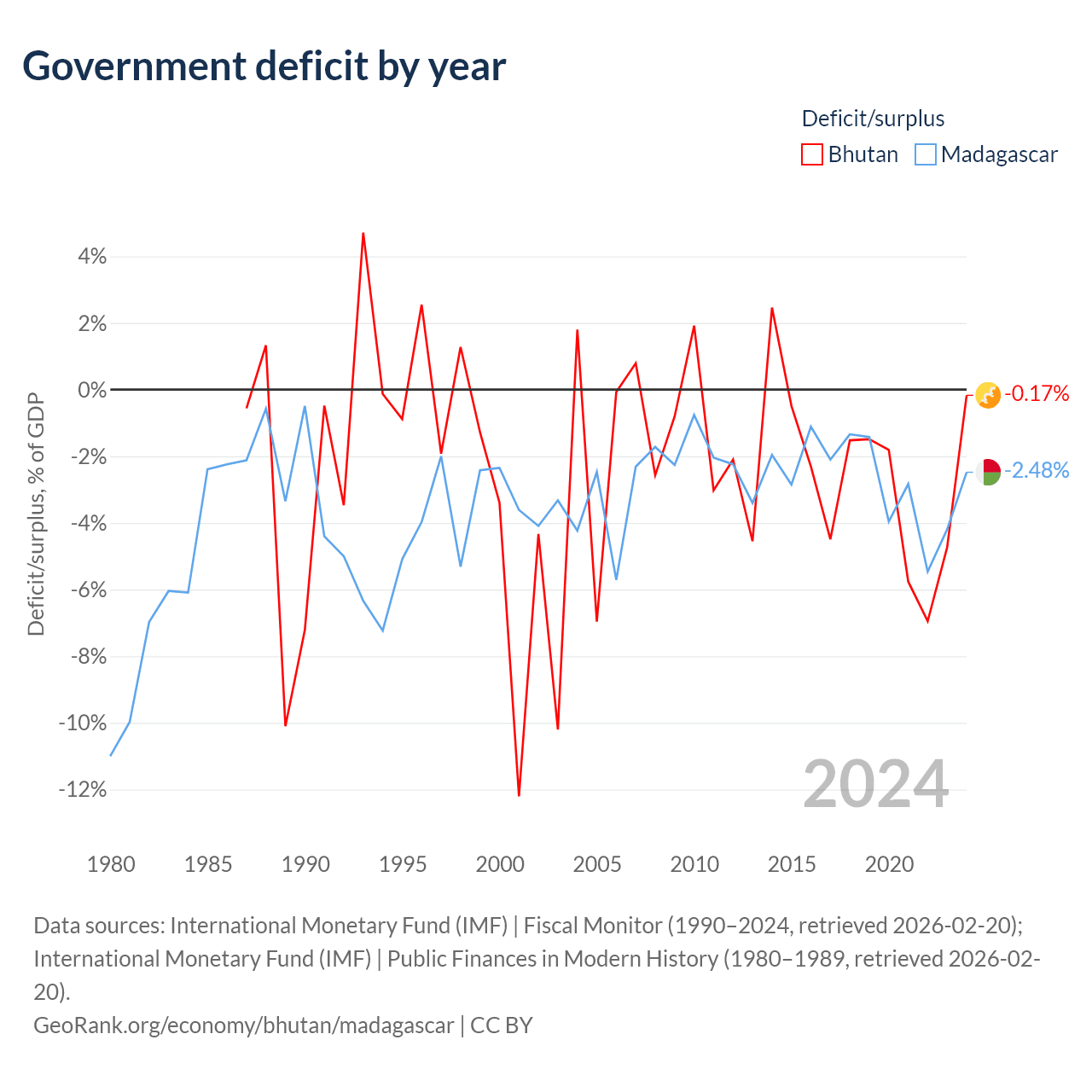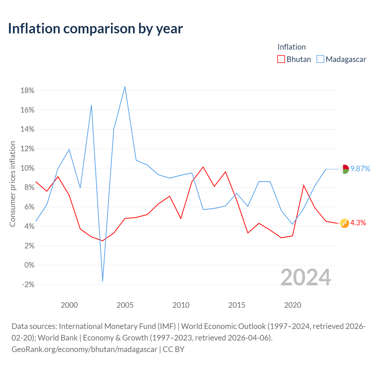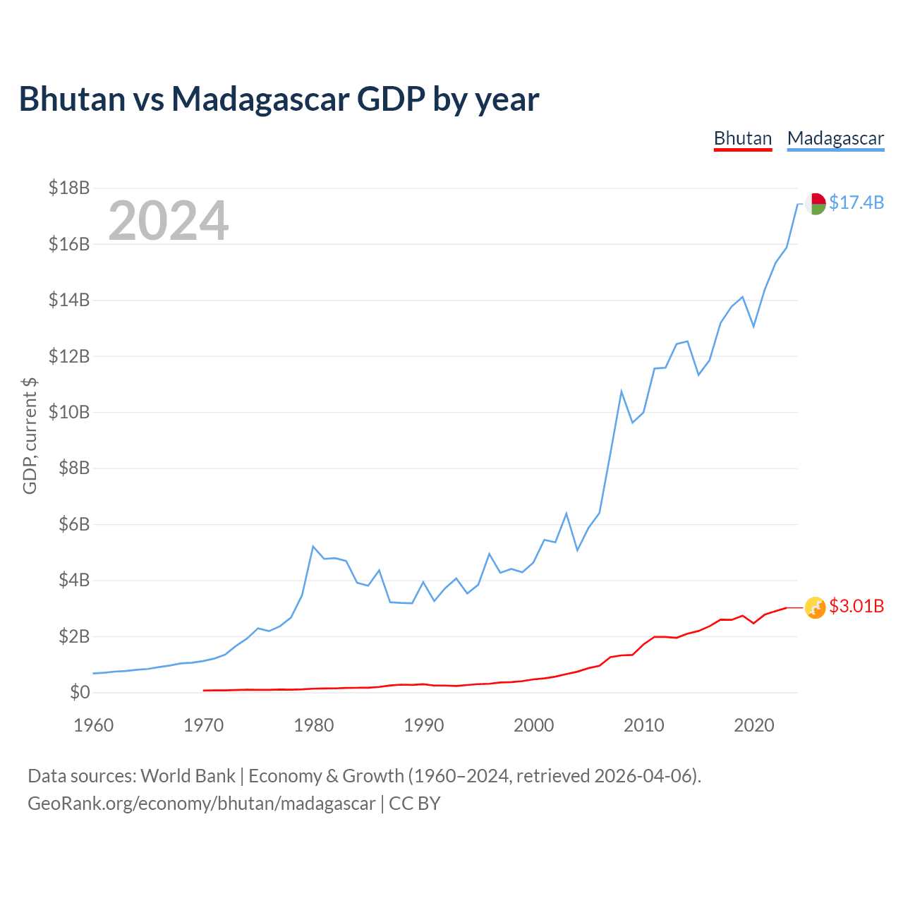 Bhutan has a GDP of $3.01B compared to $17.4B for Madagascar, ranking 170/197 and 136/197 by economy size, respectively.