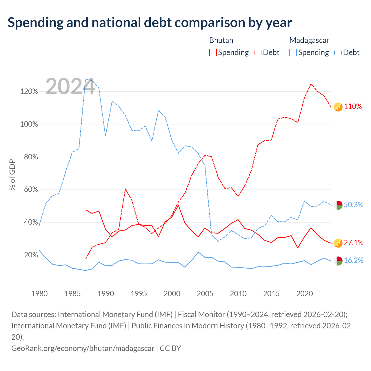 Bhutan has $3.53B in government debt (110.4% of GDP), compared to $8.77B (50.3% of GDP) in Madagascar.