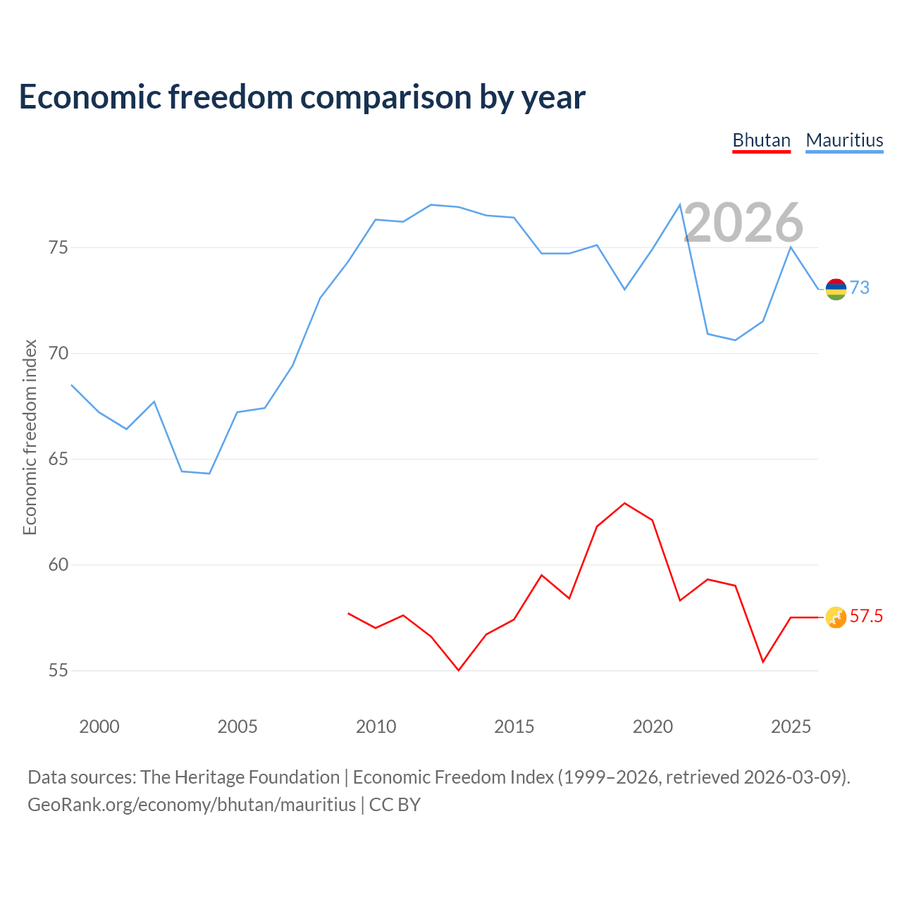The Economic Freedom Index for Bhutan is 57.5, ranking 115/197, compared to 73 for Mauritius, ranking 26/197. The chart above displays a comparison of annual changes in economic freedom indexes.