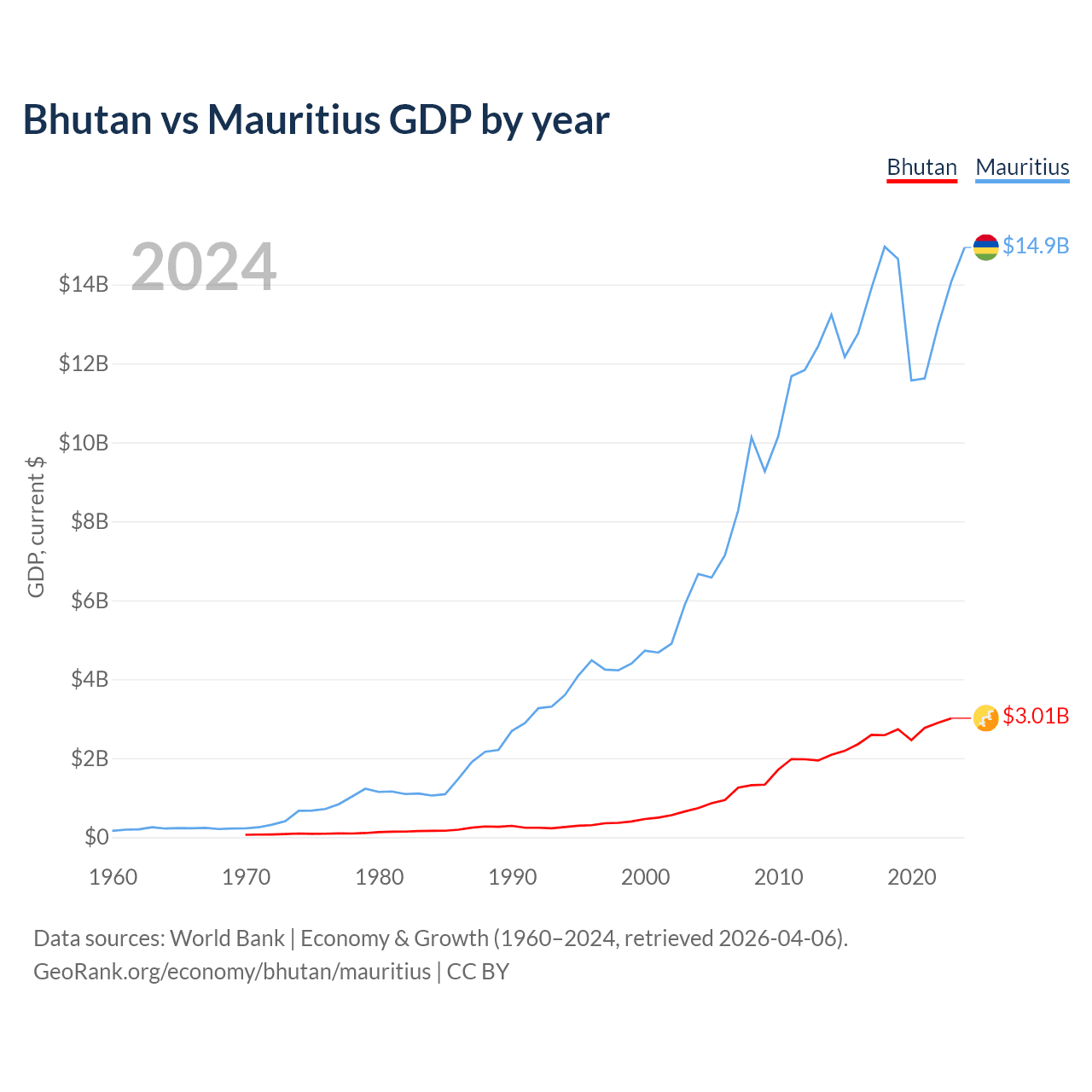 Bhutan has a GDP of $3.01B compared to $14.9B for Mauritius, ranking 170/197 and 143/197 by economy size, respectively.