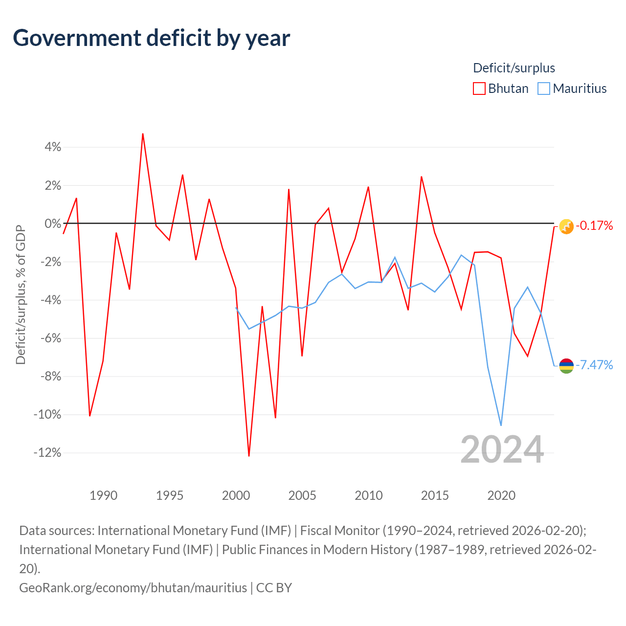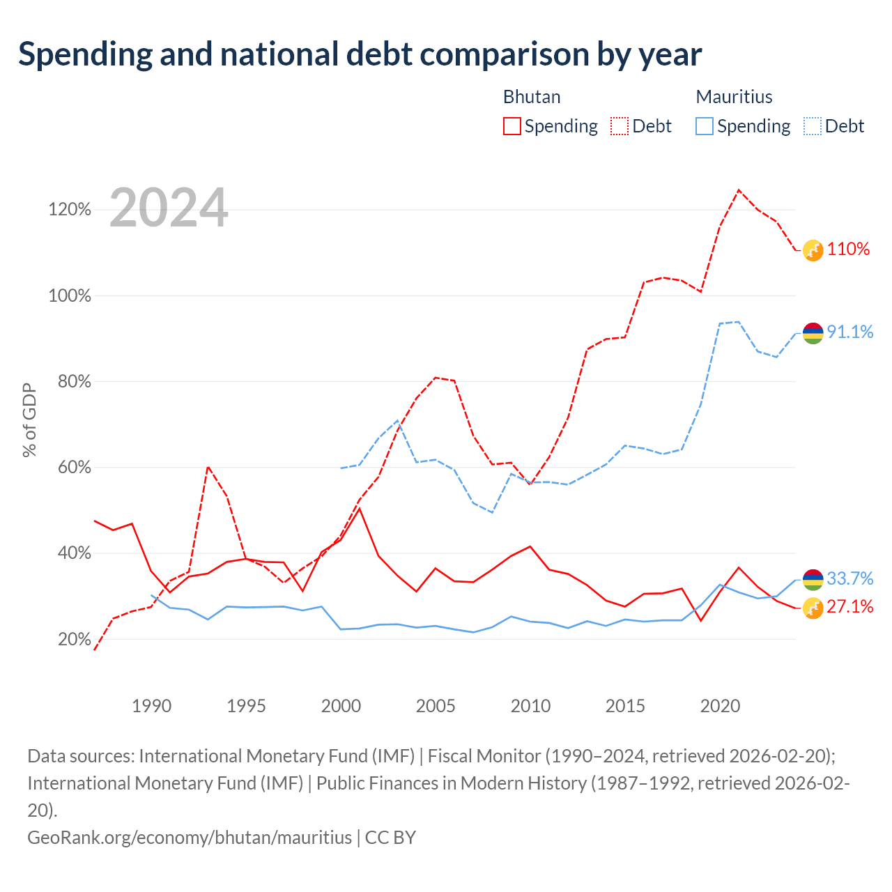 Bhutan has $3.53B in government debt (110.4% of GDP), compared to $13.6B (91.1% of GDP) in Mauritius.