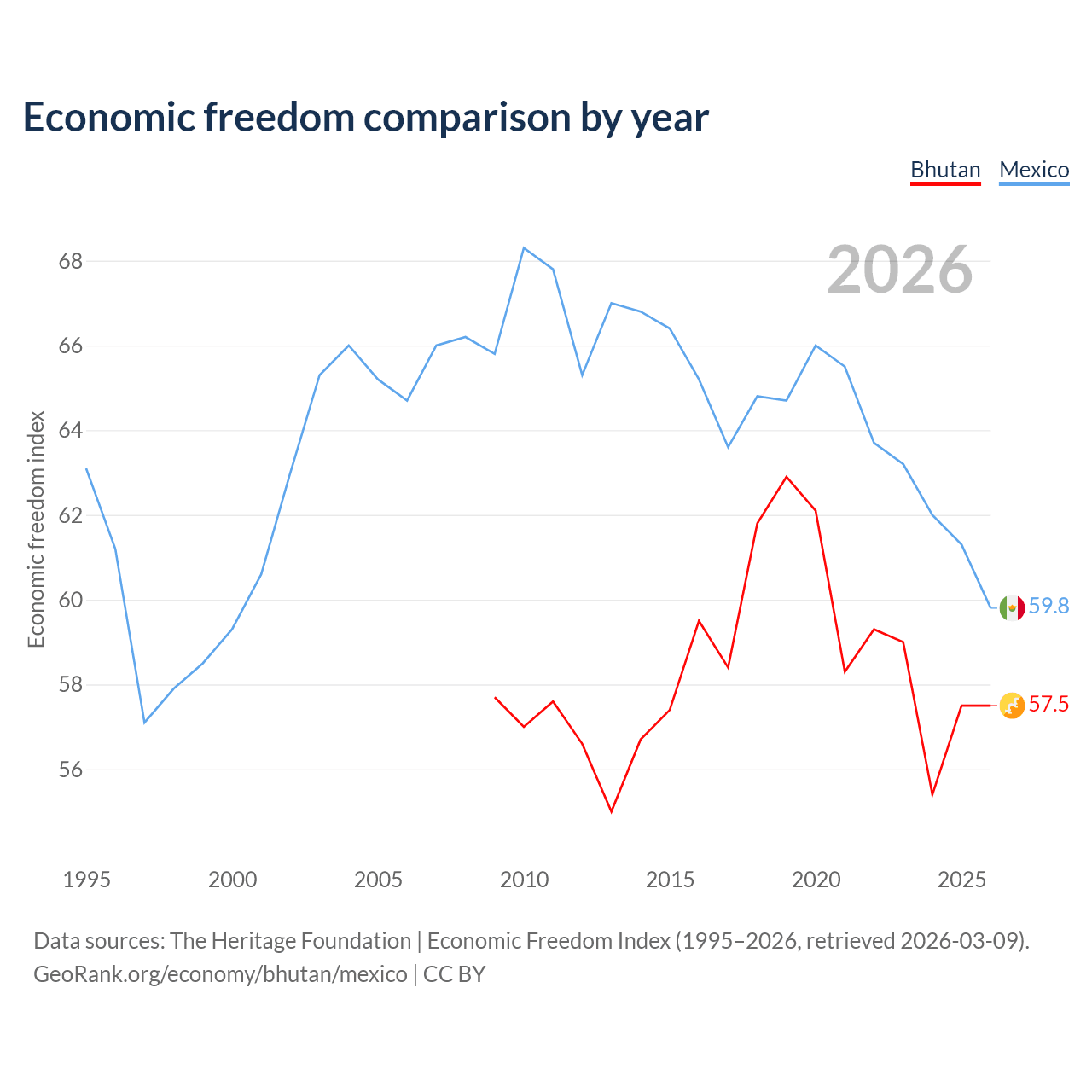 The Economic Freedom Index for Bhutan is 57.5, ranking 115/197, compared to 59.8 for Mexico, ranking 102/197. The chart above displays a comparison of annual changes in economic freedom indexes.