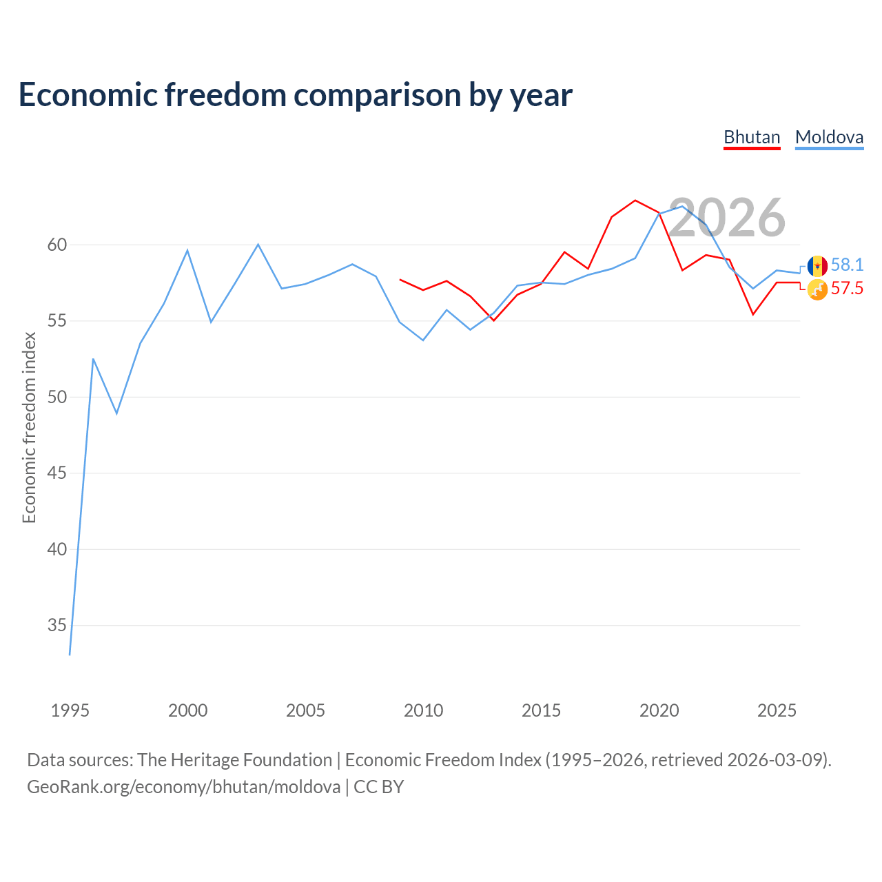 The Economic Freedom Index for Bhutan is 57.5, ranking 115/197, compared to 58.1 for Moldova, ranking 112/197. The chart above displays a comparison of annual changes in economic freedom indexes.